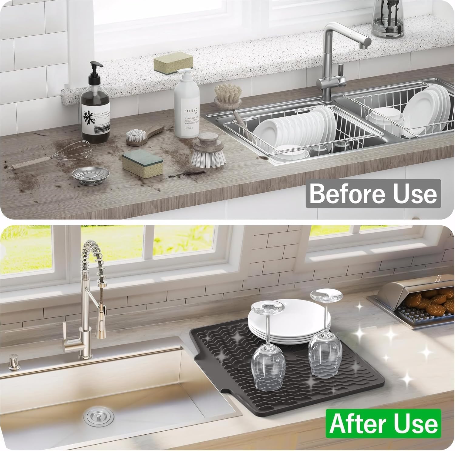 - 🔄 Space-Saving & Multi-Scene Use – Fold. Store. Use Anywhere! From kitchens to picnics, this collapsible silicone mat folds flat for effortless storage. Unfold it as a sink liner mat for dish drying, a coffee station pad to catch drips, or take it outdoors as a portable picnic drying pad! Replaces paper towels and bulky racks, saving 80% storage space. The ultimate multi-purpose kitchen mat for minimalist living.