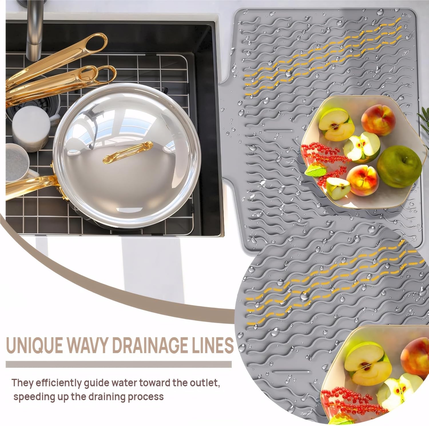 - đź’¦ Rapid Drainage Design-Engineering with deep wavy channels and a centeral drainage outlet, this dish drainers for kitchen counter accelerates water runoff 50% facster than flat mats. No more soggy sponges or stagnant puddles! The slope design directs liquid instantly towards your sink, keeping your countertops dry and clean, and says goodbye to wet.