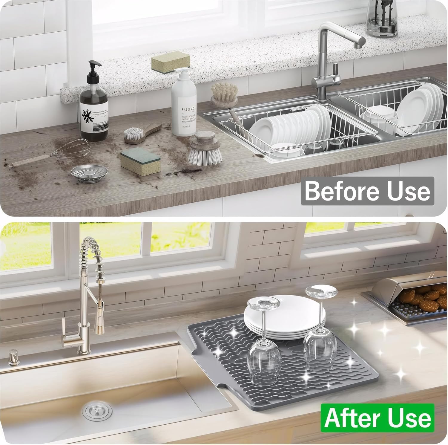 - 🌿 Effortless Clean & Reusable –Made of food grade silicone, this dishwasher-safe draining mat for kitchen counter resists stains and odors. Toss it in the dishwasher weekly or rinse in seconds—no scrubbing! A sustainable alternative to disposable paper towels and plastic racks. Zero-waste, non-toxic, and built to last years. Invest in a reusable sink mat that’s kind to your home and the planet!