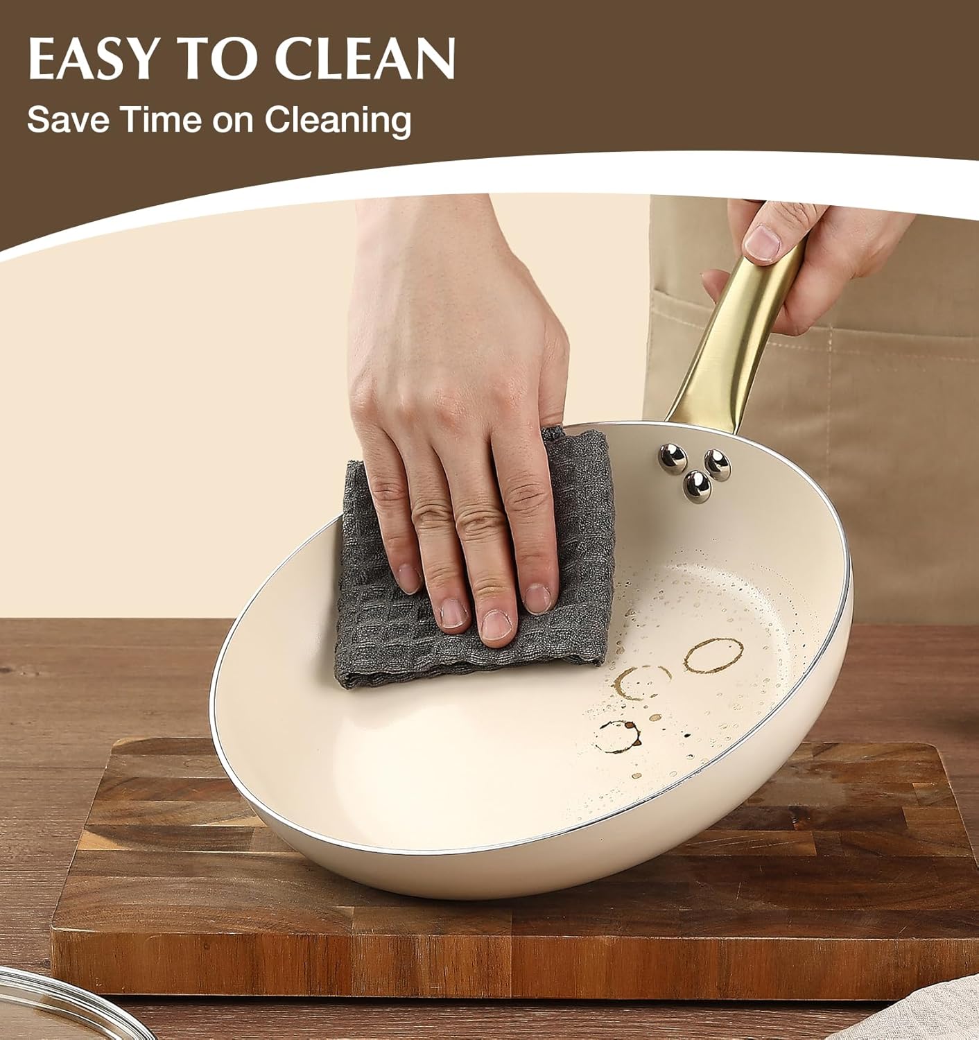 KOCH SYSTEME CS Nonstick Frying Pan with Lid, 10 Inch Non-Stick Skillet with Gold Stainless Steel Handle, Omelet Pan with Nonstick Ceramic Coating, PFOA Free, Induction & Oven Safe, Cream White
