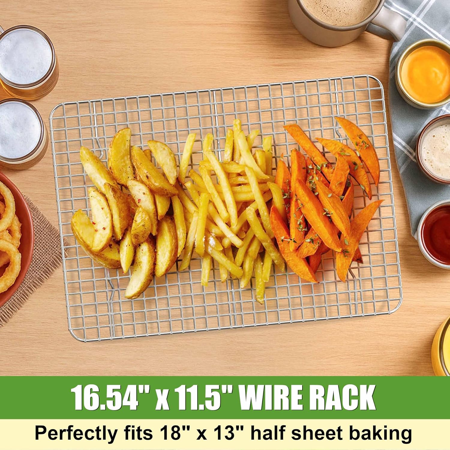 - Perfect size, 16.5" x 11.5" x 0.75" cooling racks fit perfectly inside 18" x 13" half sheet pans and they can also be used separately, the cooking racks are oven safe up to 450 °F so you can bake and cool the baked foods in one rack, mirror finish for effortless food release