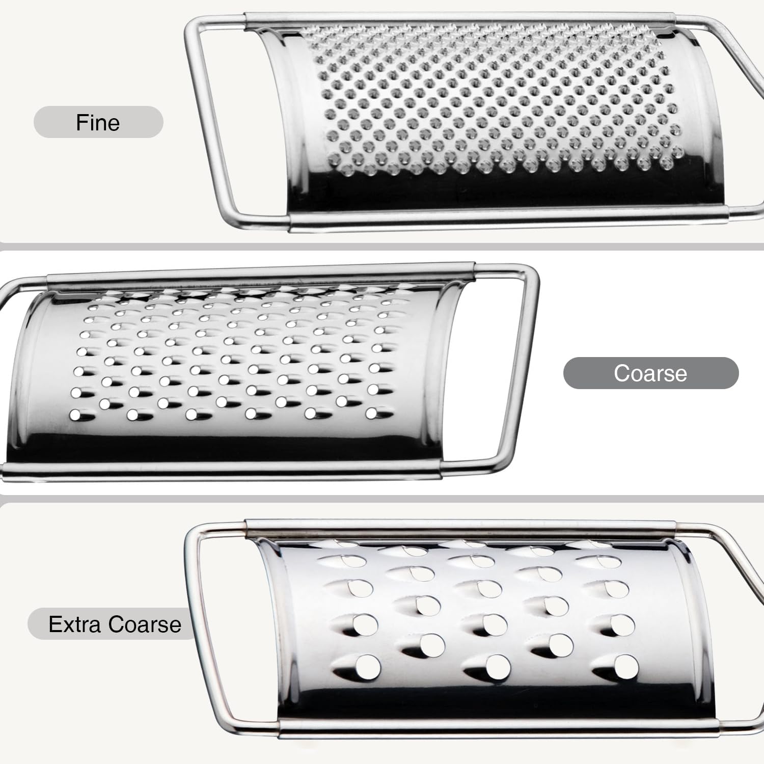 - Multi-Purpose: The coarse shred grater handles cheese, cabbage, and root vegetables; the medium grater is ideal for carrots, zucchini, and cucumbers; while the fine grater creates smooth purees for soups, sauces, or baby food.