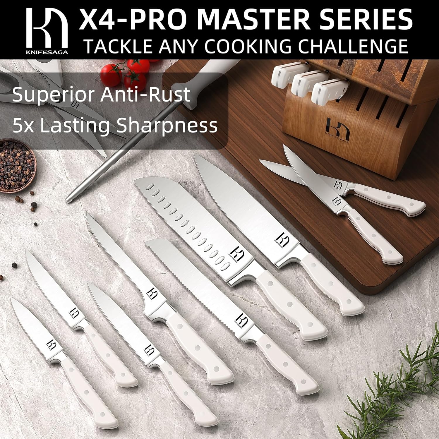 Knife Set, 15 Pcs Kitchen Knife Block Set, Enduring Razor-Sharp Japanese High Carbon Stainless Steel Chef Knife Set with Block and Sharpener, Premium Knives Set for Kitchen, White Acacia
