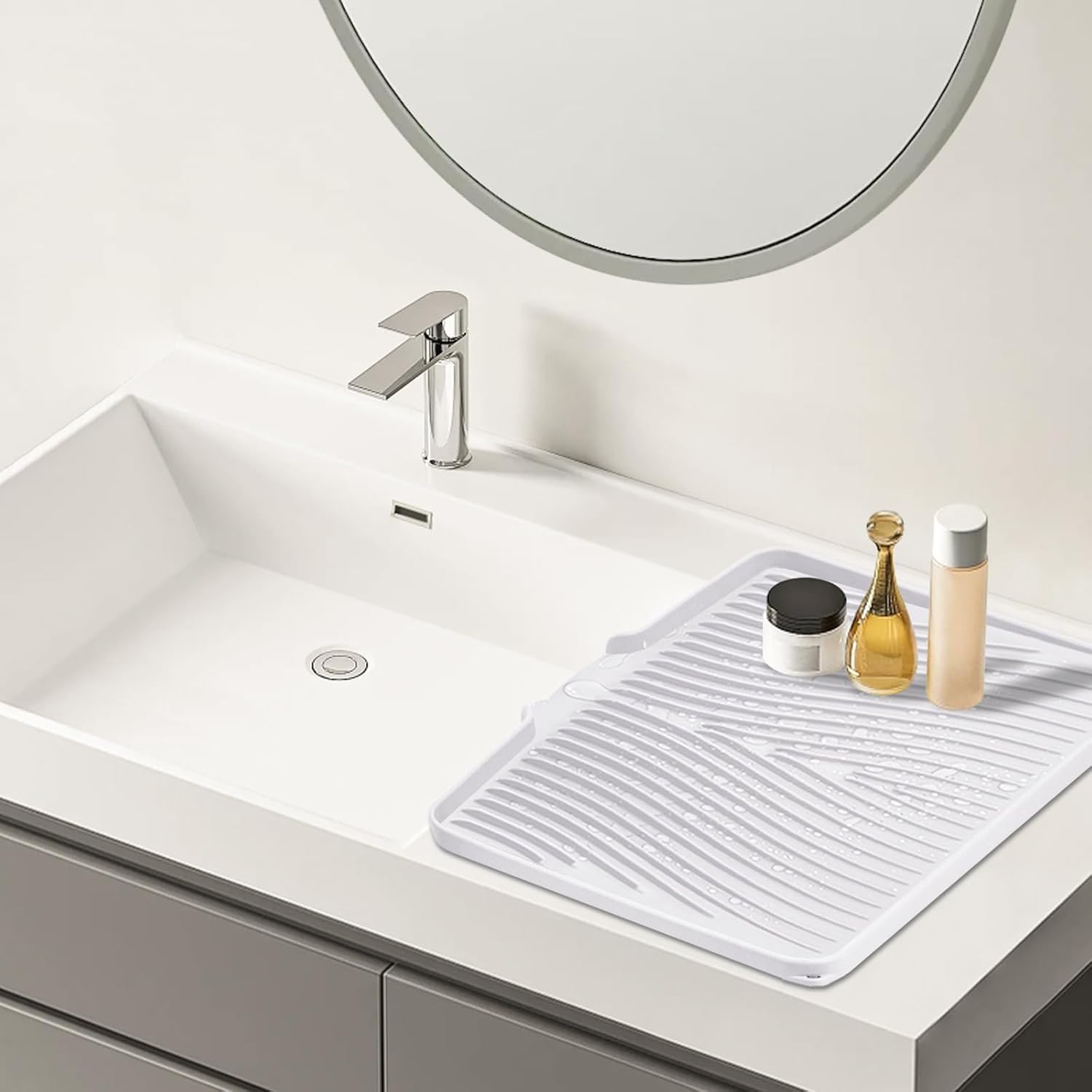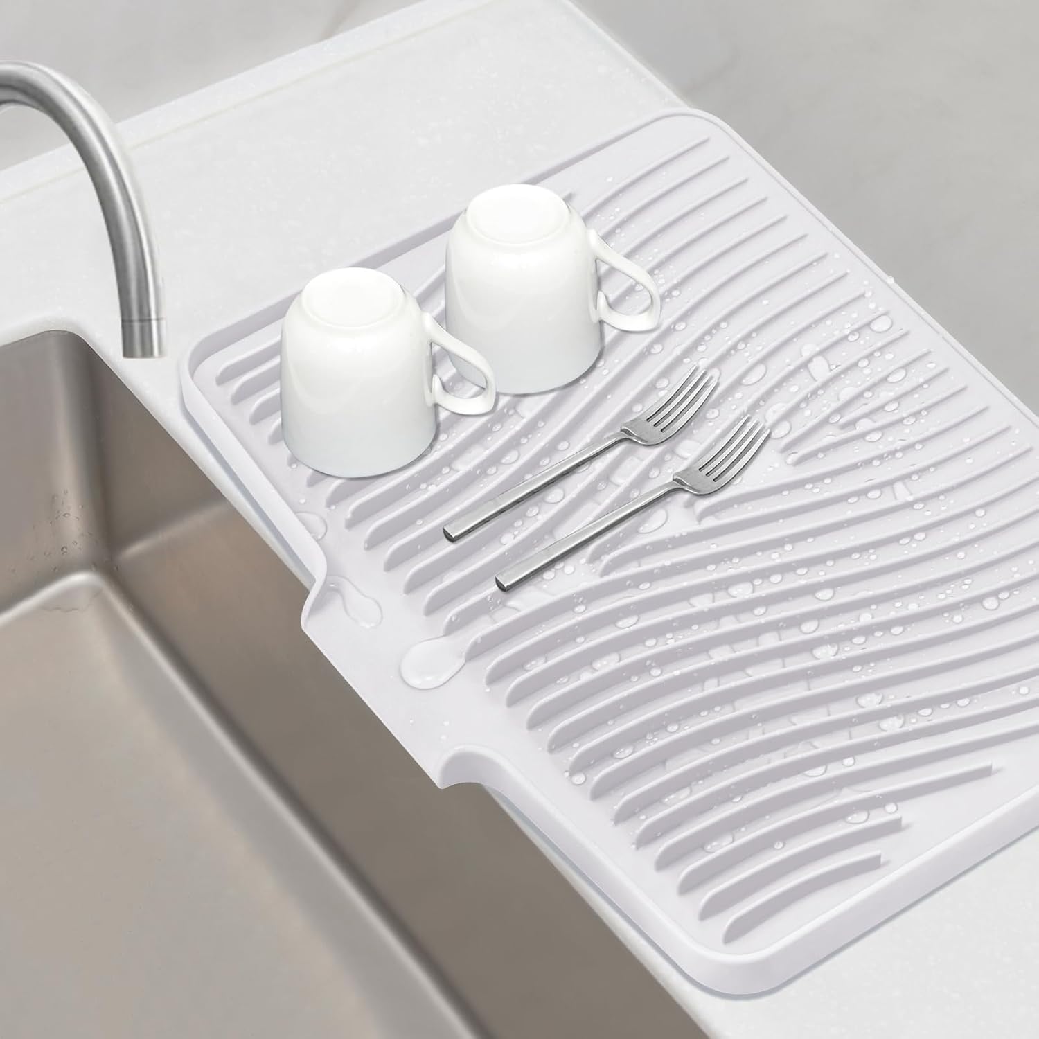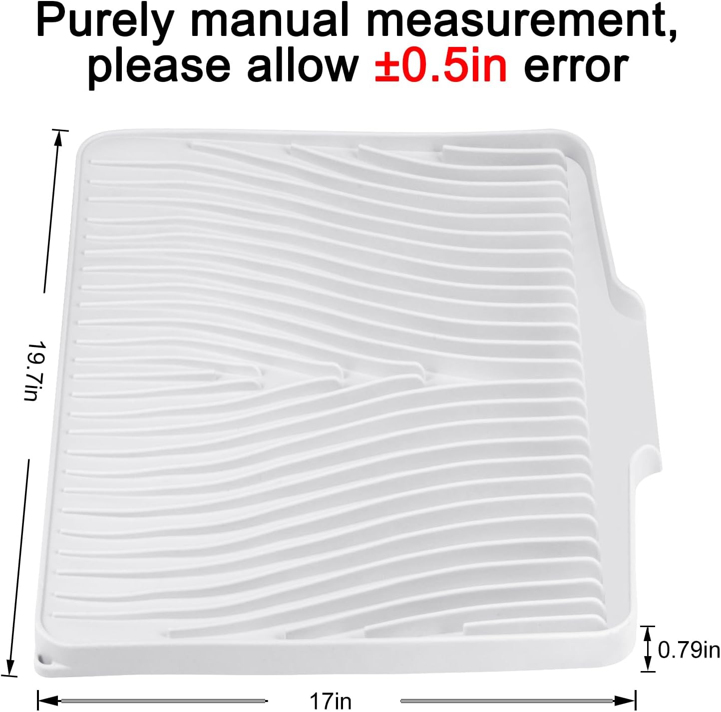 - Quick Drying Mat: TIKNIK dish drying mat measures 19.7" x 17", where washed dishes can be placed for air drying. The folding, raised and innovative design of the quick dry dish mat allows air to circulate under the dishes,and features unique diagonal ridges to easily remove moisture, and a specially designed rim that lets water drain directly into the sink. This keeps your countertops dry and clean, and says goodbye to wet countertops.