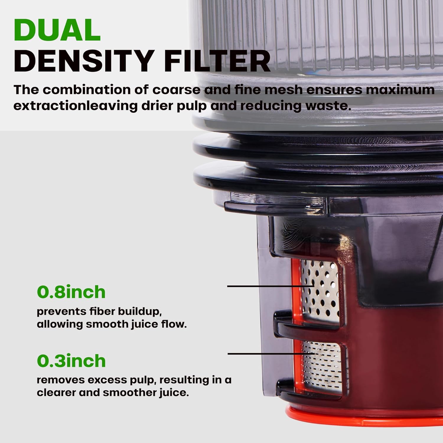 - 【Powerful 250W DC Motor – Strong, and Efficient】: Equipped with a robust 250W direct current motor, this slow juicer provides strong torque at low speeds for maximum juice extraction with minimal noise.Since it doesn't require high-speed rotation like centrifugal juicers, it doesn't generate excessive heat, preventing the loss of nutrients. Additionally, because the slow juicer grinds all ingredients, the juice extracted is 40% more than that from regular juicers, which means a significant reduction in food waste.