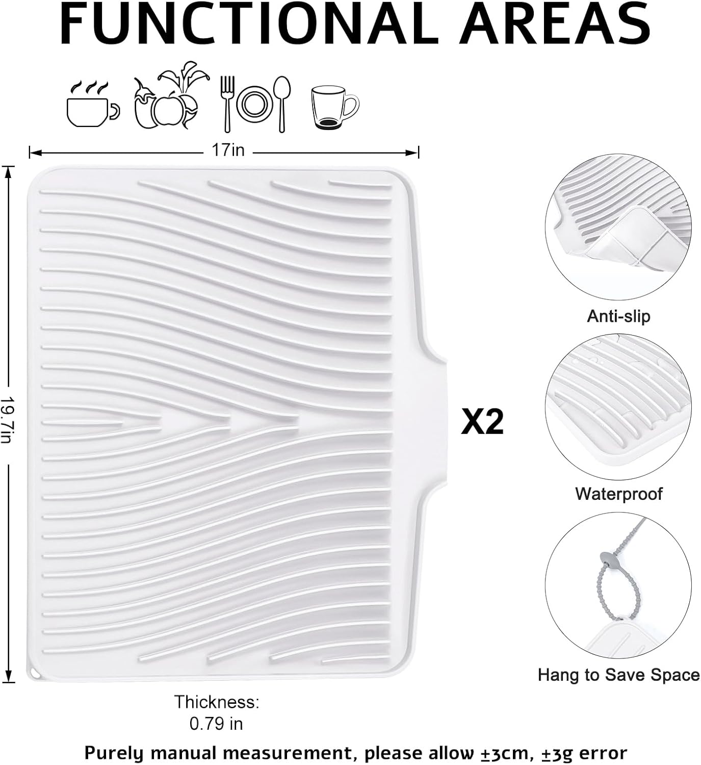 - Fast Dish Drying Mat: The TIKNIK 2-Piece Set includes two dish drying mats for kitchen countertops, measuring 19.7" x 17" x 0.59" (L x W x H) The kitchen drying mat features innovative ridges and unique diagonal ridges that allow air to circulate under dishes to remove moisture easily. The unique high sidewall rim prevents water from leaking out, allowing it to drain directly into the sink and keep your countertops dry.