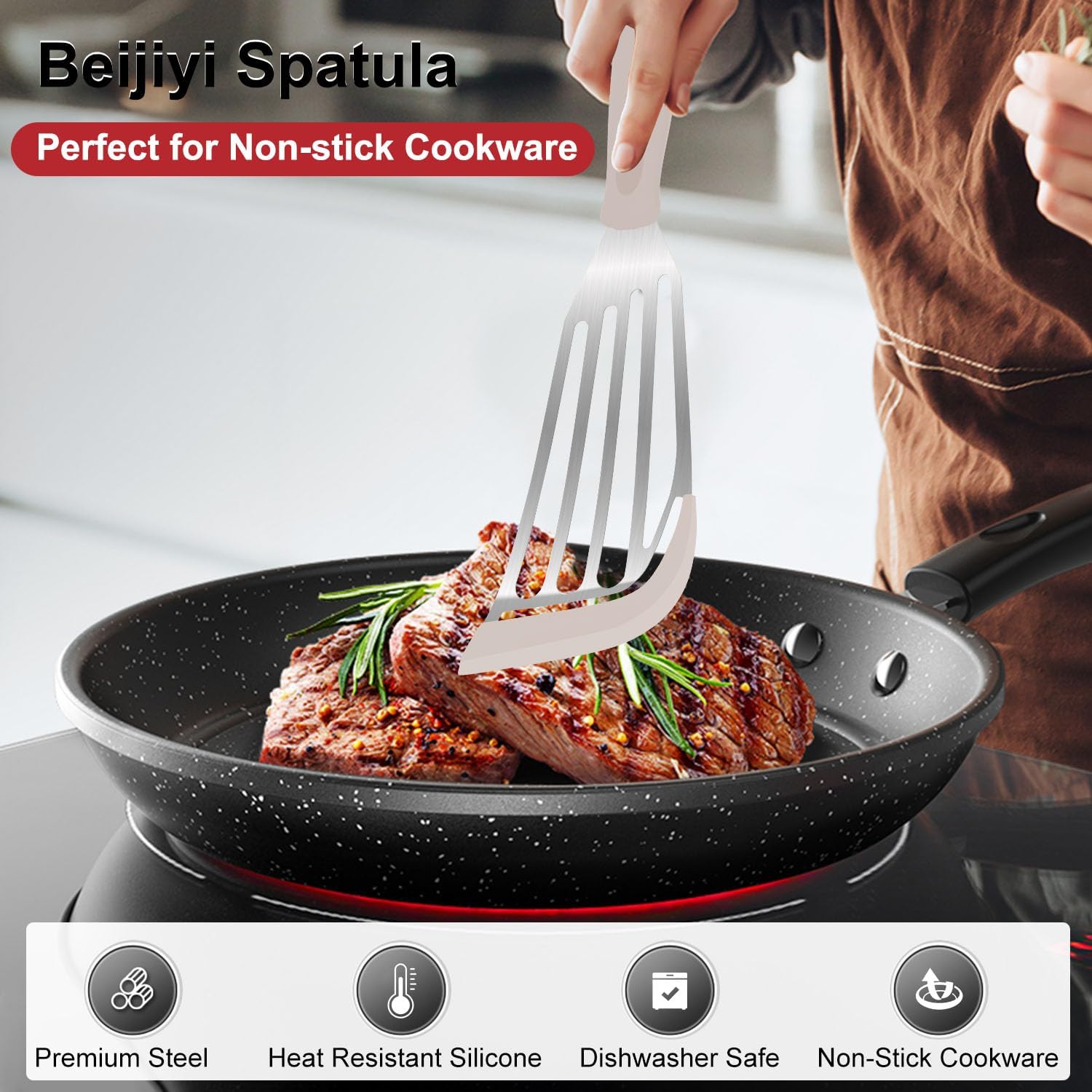 - Fish Spatula with Silicone Edge: Our fish turner kitchen spatula consists of a food-grade reinforced stainless steel core, silicone soft top edge and handle, which is high heat-resistant and rust-proof. No melt or rust