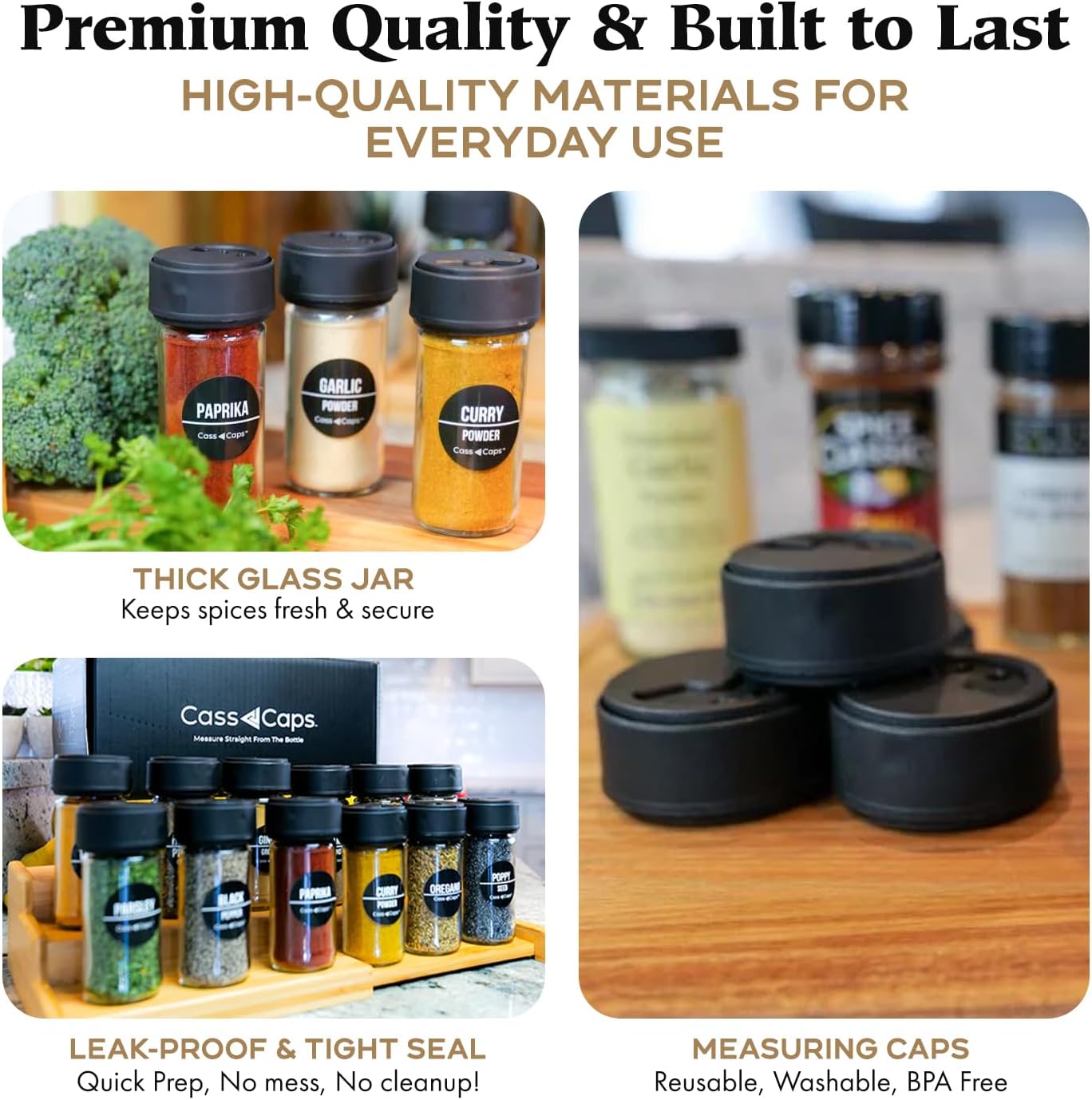 - QUICK & EASY - NO MESS: With CassCaps Measuring caps you can measure straight from our vintage spice jars into your bowl or skillet, dosing out 1/4 tsp of seasoning with each twist of the cap. Our design prevents any spills, making it ideal for clean and controlled seasoning every time you cook, with no cleanup mess. Save your measuring spoons for the liquids.
