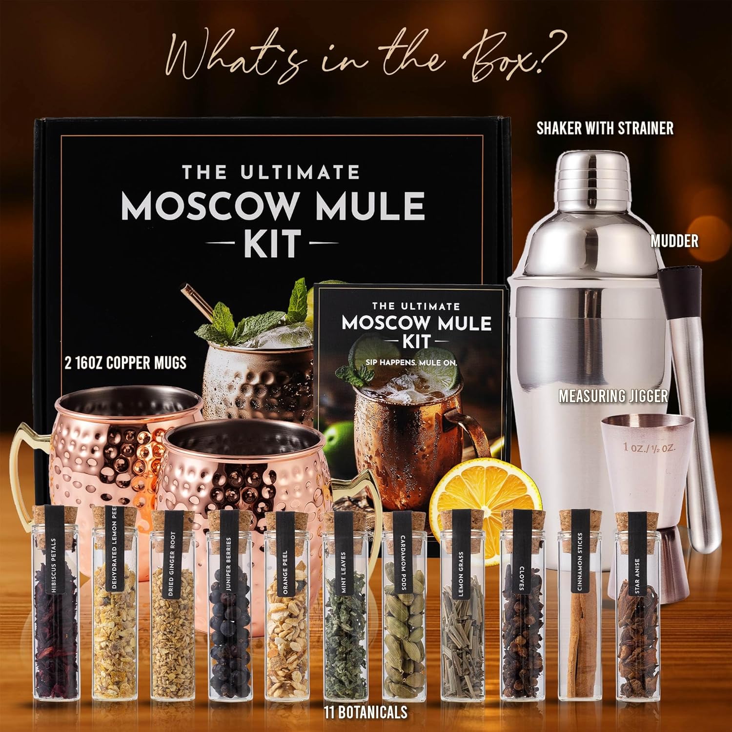 - ELEVATE YOUR MIXOLOGY GAME – COMPLETE MOSCOW MULE KIT GIFT SET - Craft the perfect cocktail with this premium 2-copper mug mule set featuring a 550ml stainless steel cocktail shaker, jigger, muddler & 11 exotic botanicals for next-level flavor infusions