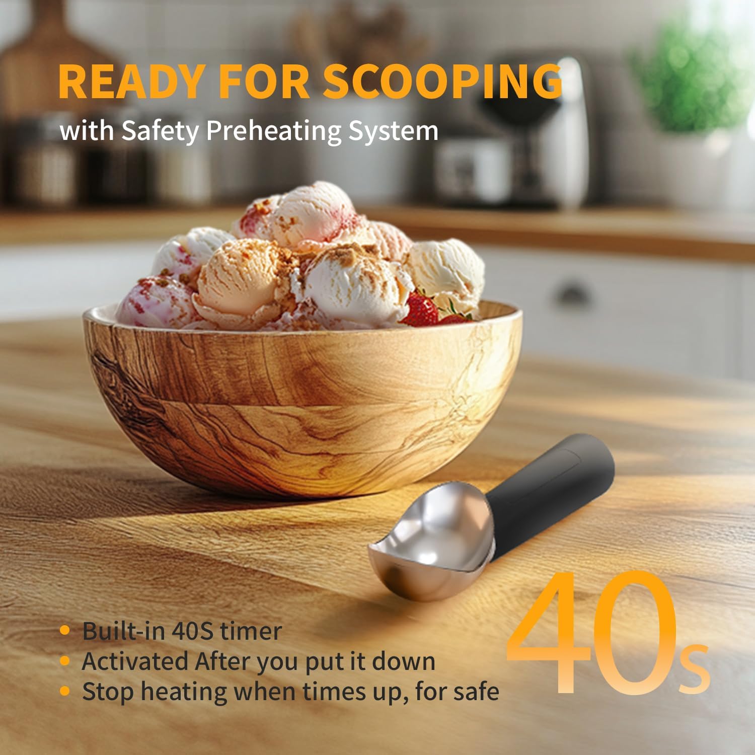 - 【Natural to Use】 Built-in grip sensor starter, hold then start heating, As nature to use as regular scoop. Also built-in 40 seconds timer, activated after put it down,Always standby for next scooping.