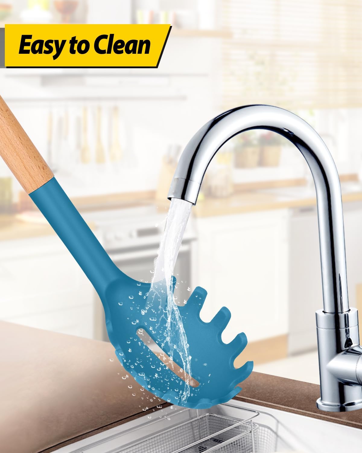 Silicone Pasta Fork and Ladle Spoon Set with Wooden Handle, Heat Resistant Non Stick Kitchen Utensils for Cooking, Stirring, Serving Spaghetti, Soup, Sauce(BLUE)