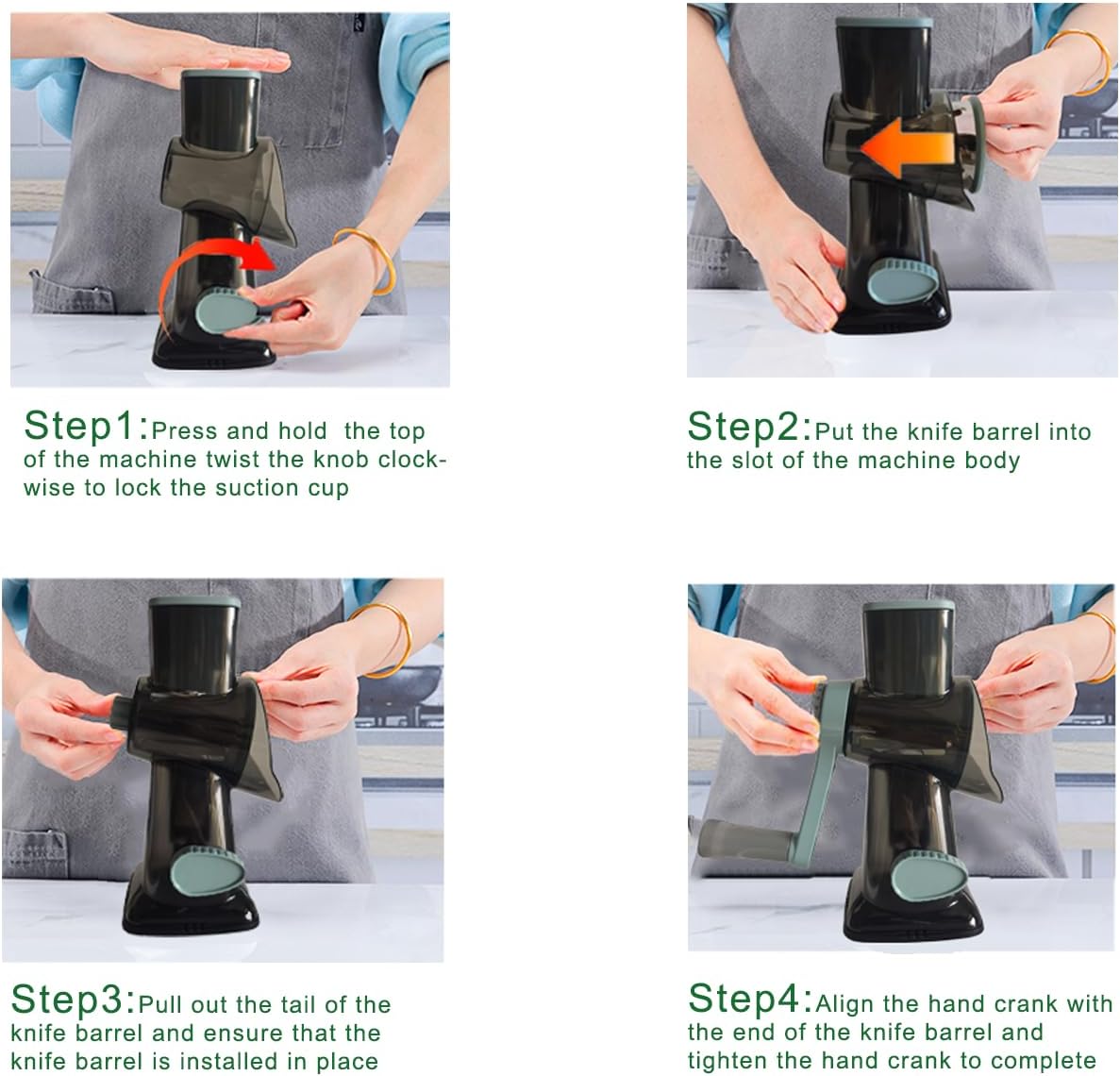 - 【Easy Installation】Simply rotate the switch located on the side of the cheese grater's bottom,insert the blades,and rotate the handle to secure them in place;Cheese grater with hand crank includes a detailed instruction manual for clear guidance
