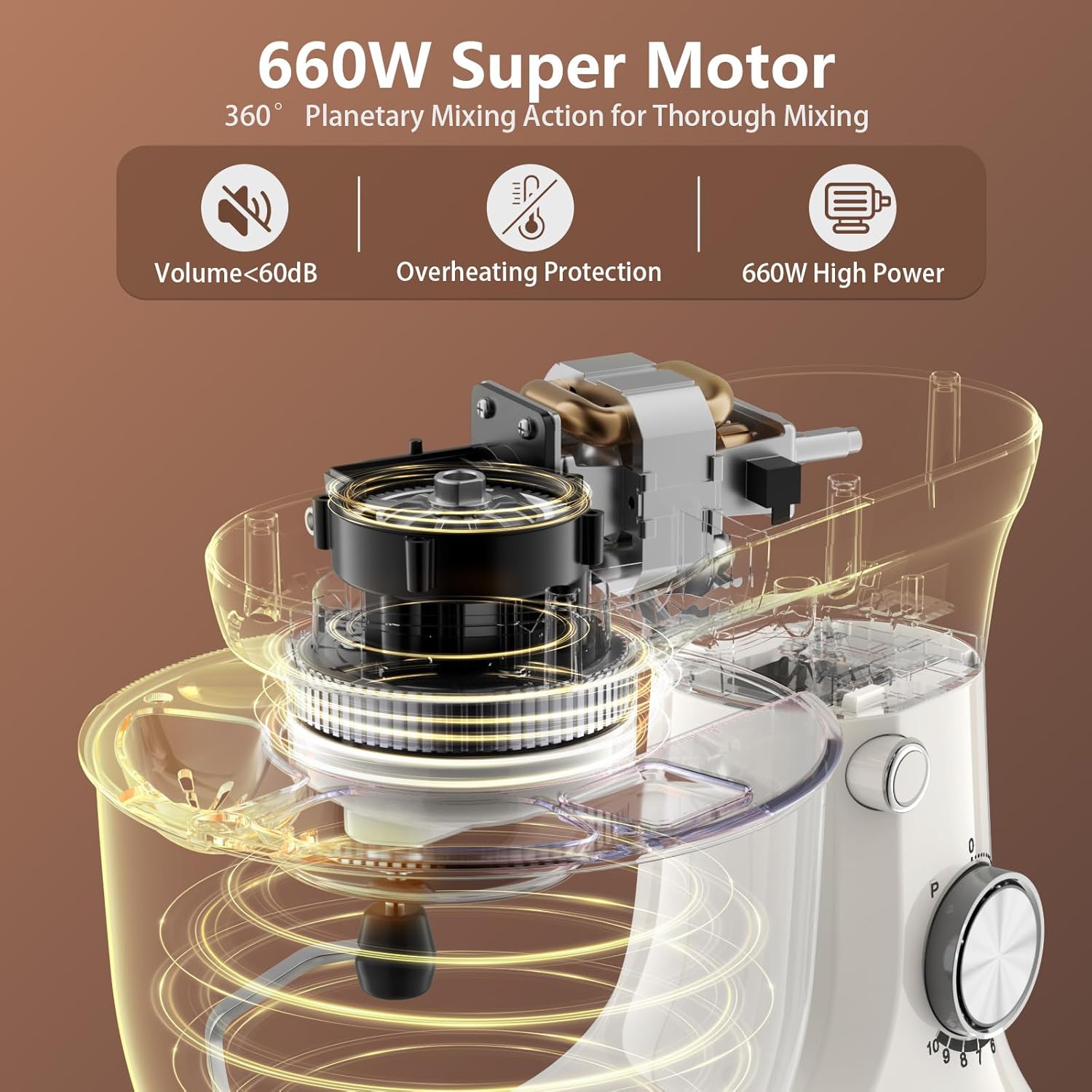 - 660W POWERFUL DYNAMICS - Powered by a precision-engineered 660W motor with copper-core technology, this mixer delivers high-torque performance . Its smart energy algorithm reduces power consumption by 35% compared to conventional models. The dual-cooling system ensures continuous 1-hour operation without overheating.