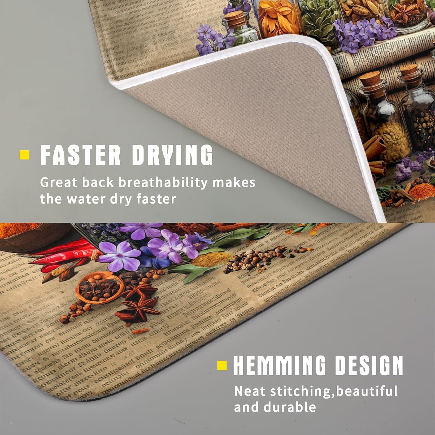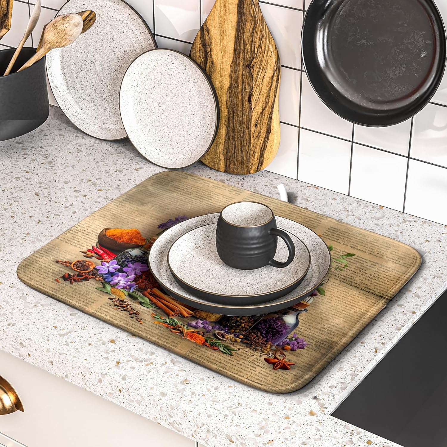 - Material: The paper decorative dish drying pad's surface is made of polyester, with a composite sponge material in the middle, which can quickly absorb water. The spices drying kitchen mat protects your counter from scuffs and scratches while also keeping your most prized glassware safe and sound