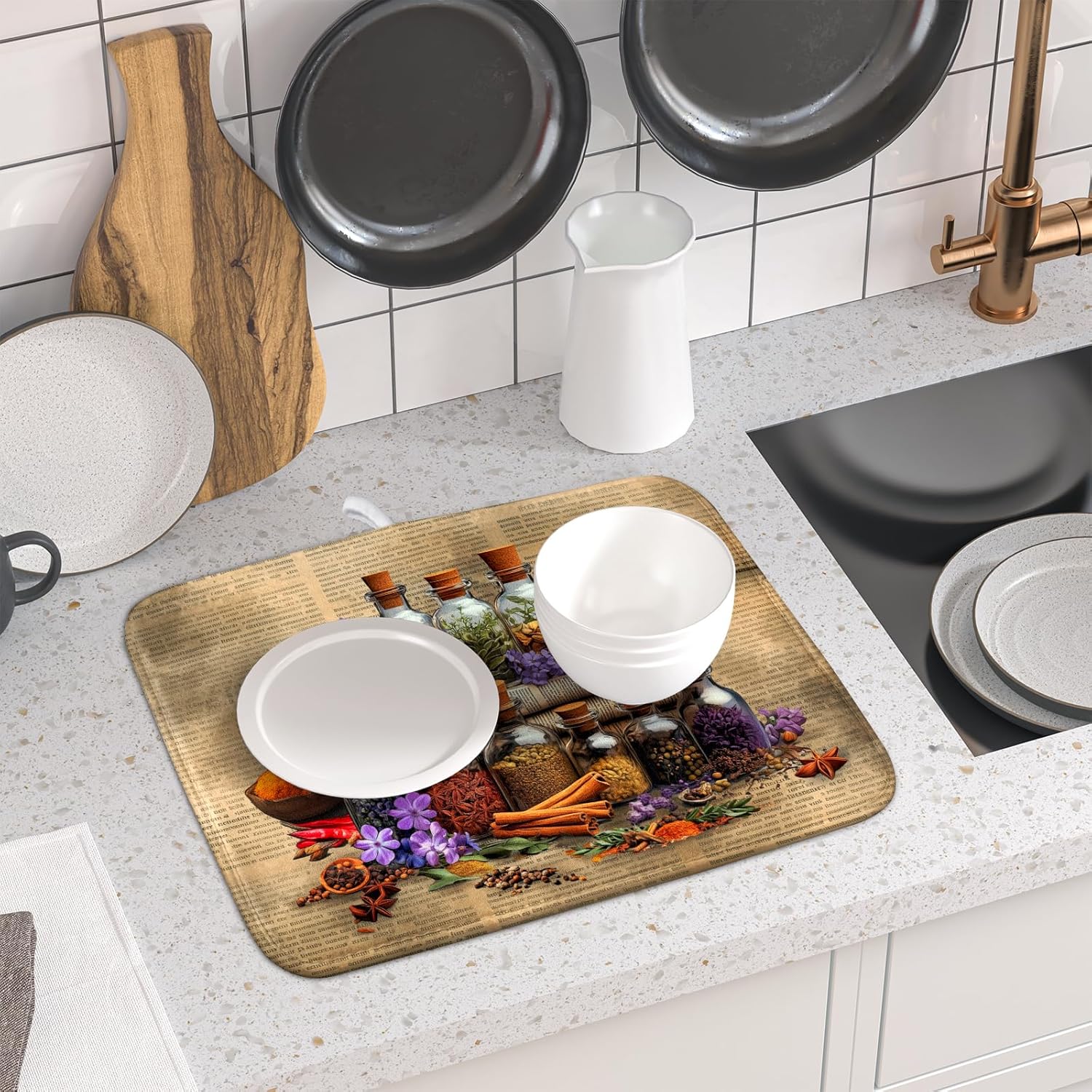Vintage Kitchen Dish Drying Mat - Spice Bottle Decorative Dish Sink Rack Pad 16 X 18 Inch