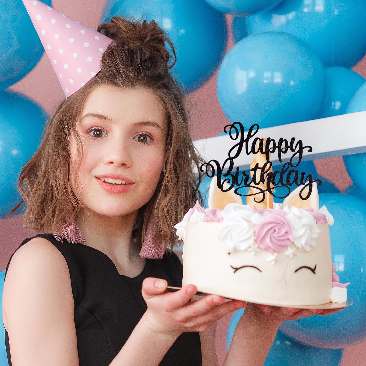 Happy Birthday Cake Toppers 9 Inch Glitter Happy Birthday Cake Pick for Birthday Anniversary Theme Party Cake Decorations Supplies - Black