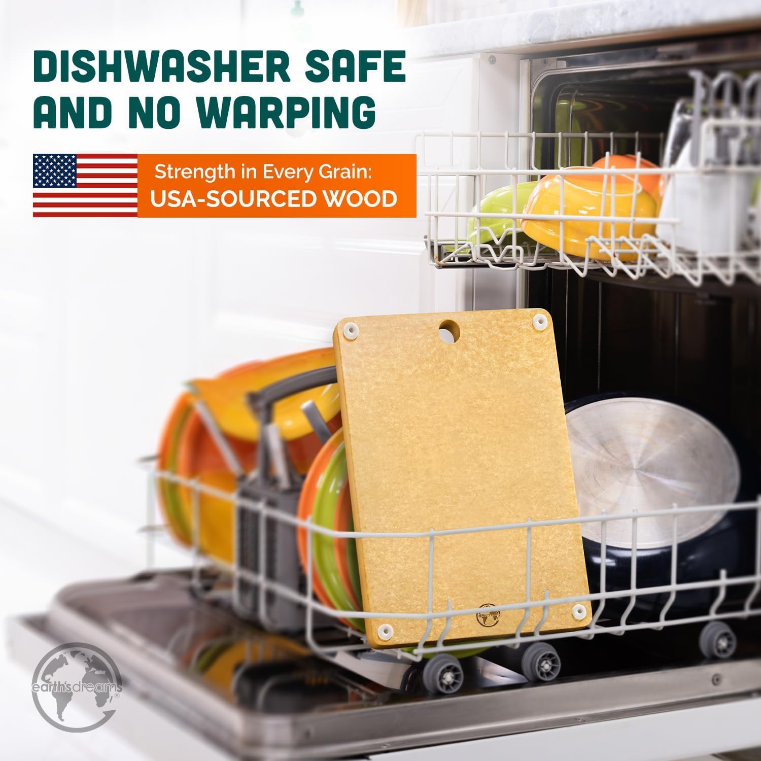 - CUTTING BOARD DISHWASHER SAFE – Keeping your cutting board clean can be challenging, but not with Earth’s Dreams. This board is made with non-toxic materials and is designed to be dishwasher-safe and non-porous, unlike bamboo cutting boards which are often not hygienic or dishwasher friendly.