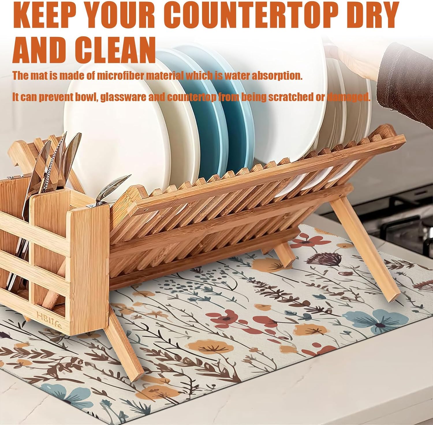 Vintage Floral Dish Drying Mat for Kitchen Counter Microfiber Absorbent Dish Kitchen Drying Mat Draining Reusable Washable for Dishes/Utensils/Counterto