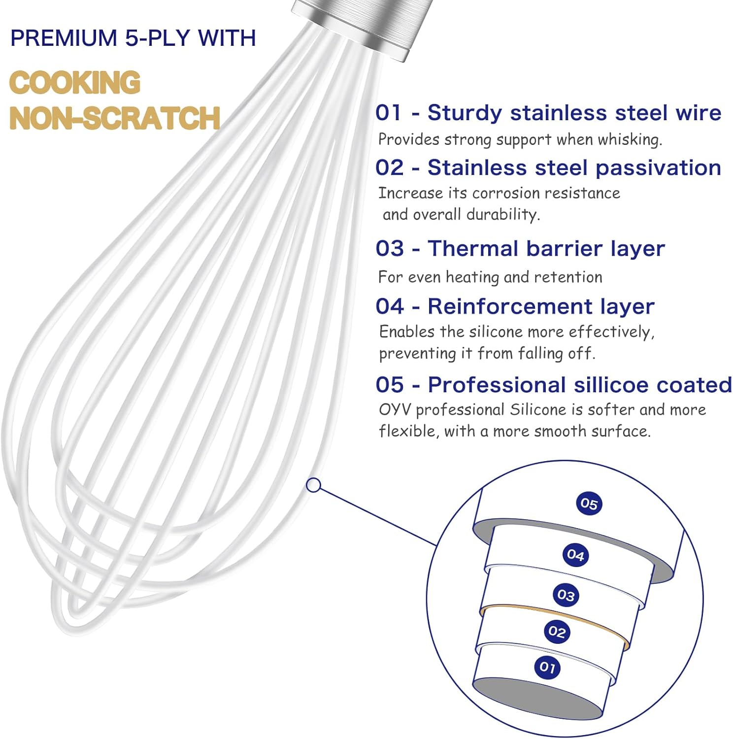 - PROFESSIONAL SILICONE WHISK FOR COOKING NON SCRATCH:OYV silicone whisk head is made of 1.75 mm durable stainless steel wires coated in 0.4 mm professional non scratch silicone.Our professional Silicone material is softer and more flexible,with a more smooth surface that won't scratch or damage the surface of your pots, pans,or bakeware