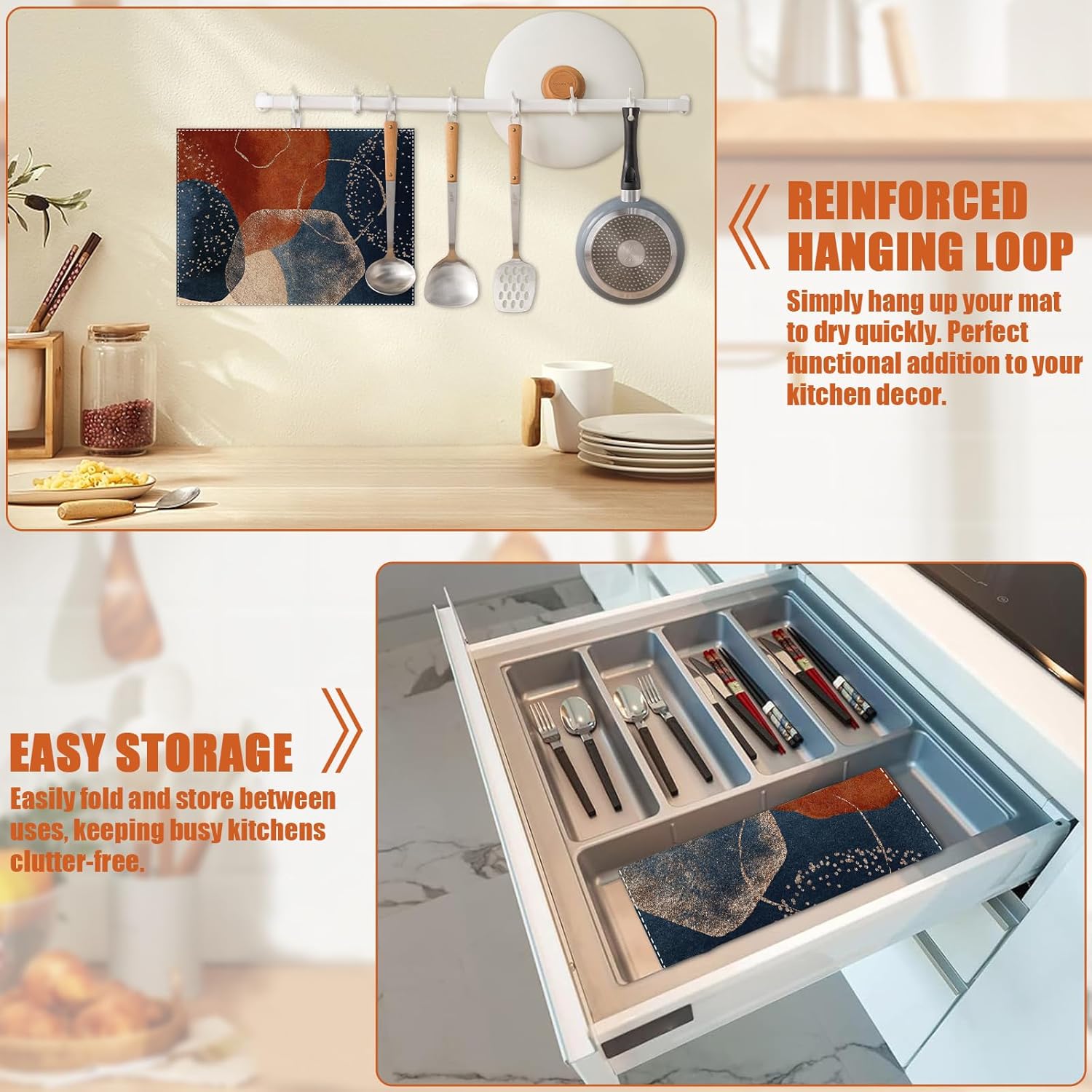 - 【Easy to Clean】The utensil drying mat can be cleaned by hand or machine to remove stains, the kitchen utensil drying mat to dry quickly without a machine. HD printed suede has excellent color lock, does not fade and can be reused many times.