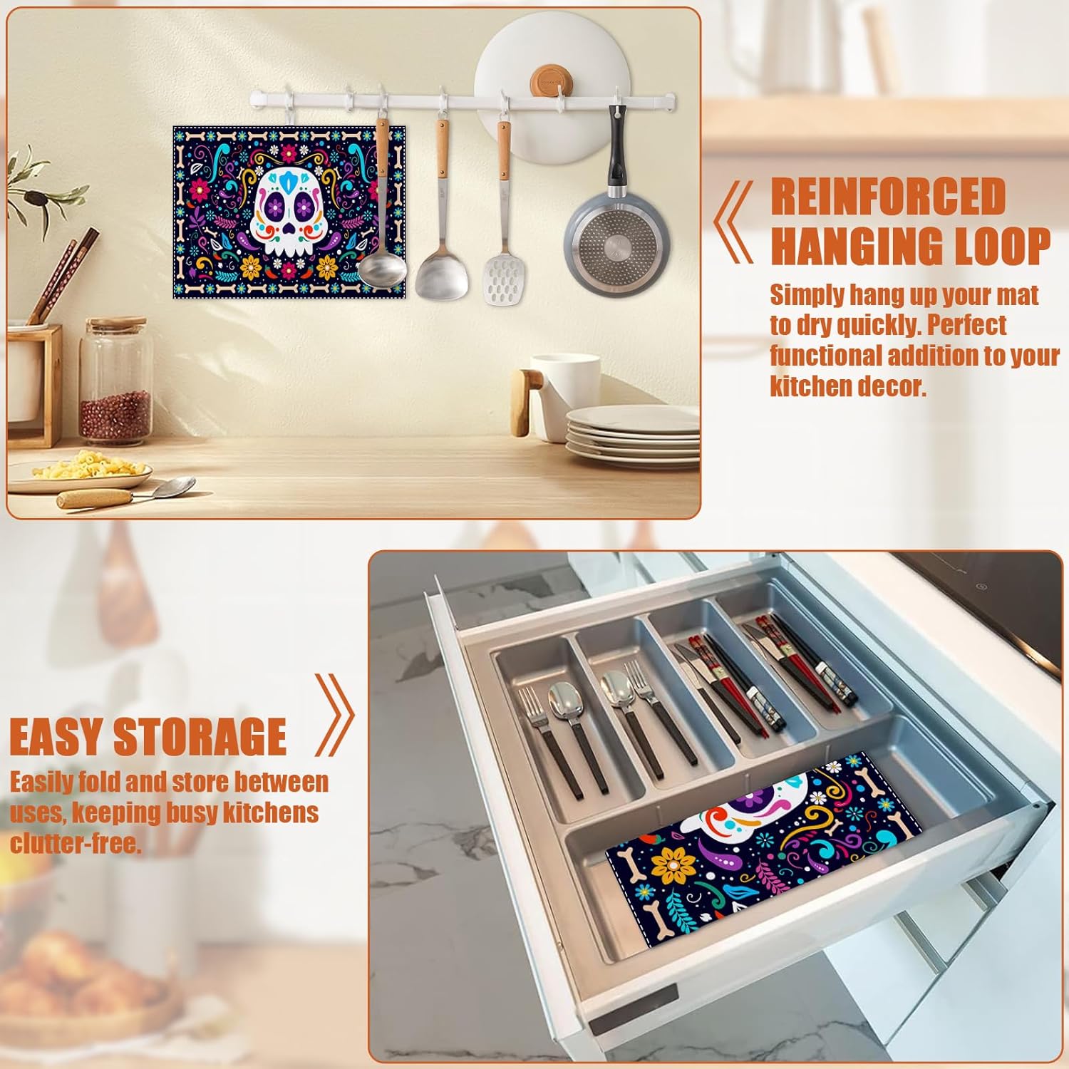 Sugar Skull Dish Drying Mat for Kitchen Counter Microfiber Absorbent Dish Day of the Dead Kitchen Drying Mat Draining Reusable Washable for Dishes/Utensils/Counterto