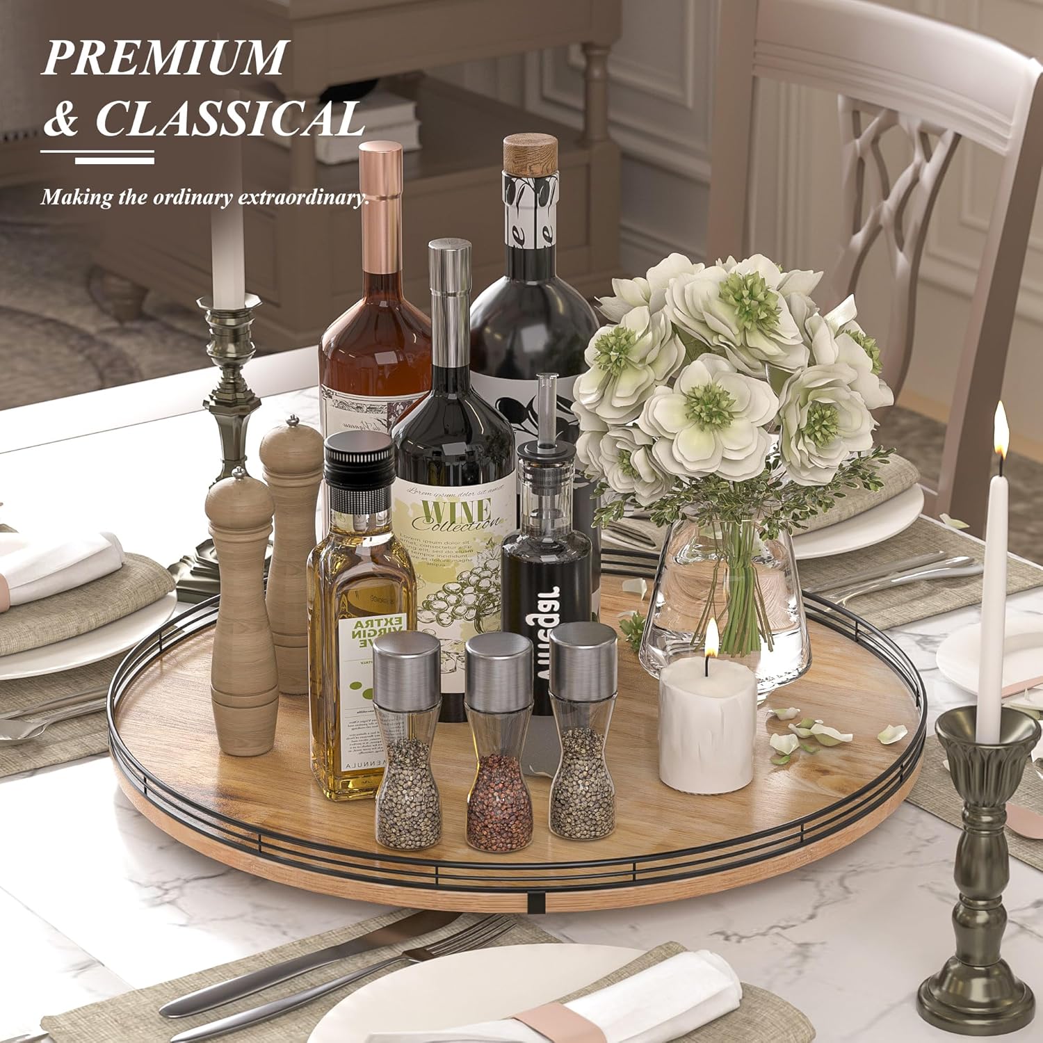 - UPDATED DESIGN: With larger wood base on this lazy Susan for table top, the turntable organizer doesn't wobble, even with heavier items on it. With premium oak wood and classical iron fence make this lazy Susan turntable stylish, functional and adding a touch of rustic charm. it’s also very easy to clean. There are included anti-slip pads on the bottom of the lazy Susan for extra surface protection.