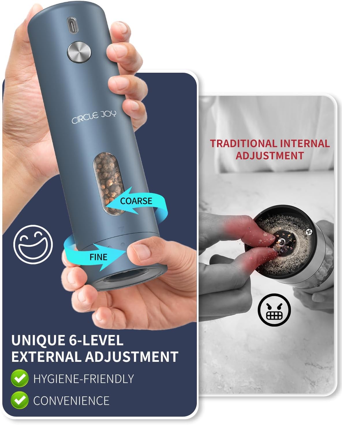 - 【HYGIENE MEETS CONVENIENCE】 - Say farewell to messy, internal adjustments and hello to a cleaner, more hygienic way to tailor your grind. CIRCLE JOY electric pepper grinder boasts an innovative external coarseness adjustment mechanism, allowing you to easily dial in your desired texture without ever having to touch the peppercorns. This keeps your hands clean while in use, making it a great choice for health-conscious cooks