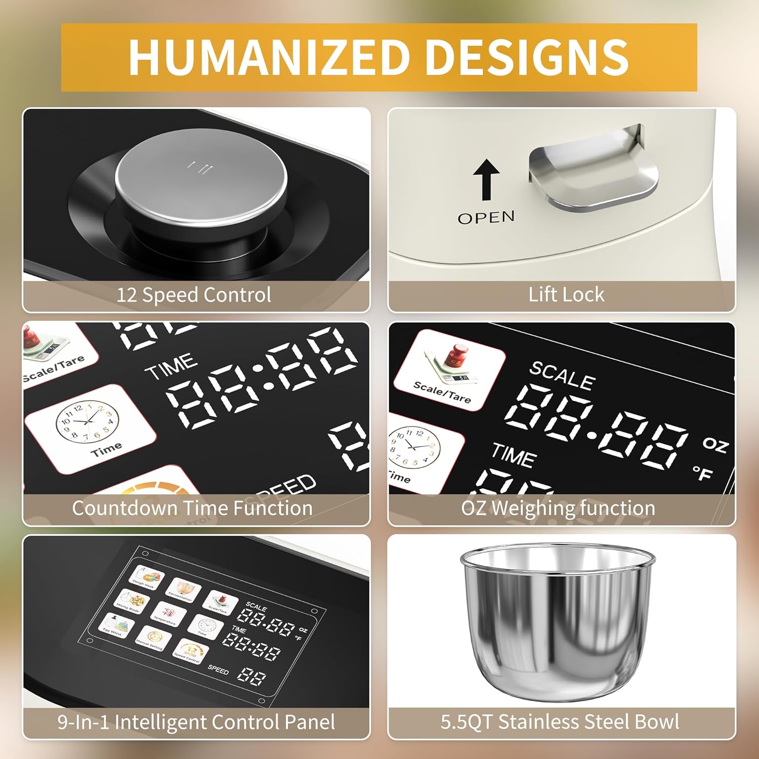 - Kitchen Scale & Heating and fermentation function - 9-in-1 Smart new touch operation panel and smart all-in-one machine with multiple functions. On one machine, you can accurately weigh the food and Heating and fermentation function.There is no need for multiple machines to do it. Only one Stand Mixer is required