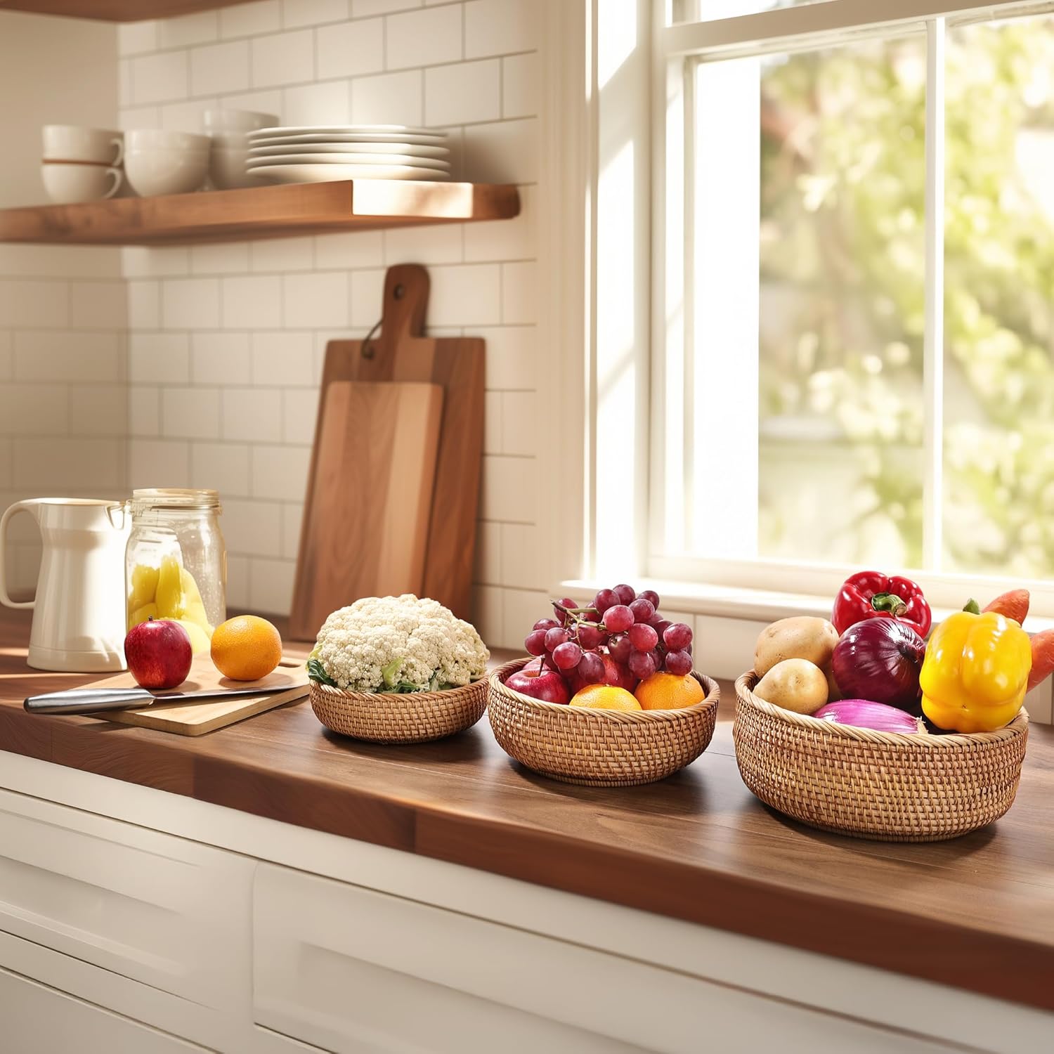 Honey Brown Natural Rattan Bread Basket Set of 3 - Handwoven Round Wicker Serving Bowls for Fruit, Snacks, Kitchen Counter Organizing | Stackable Farmhouse Decor
