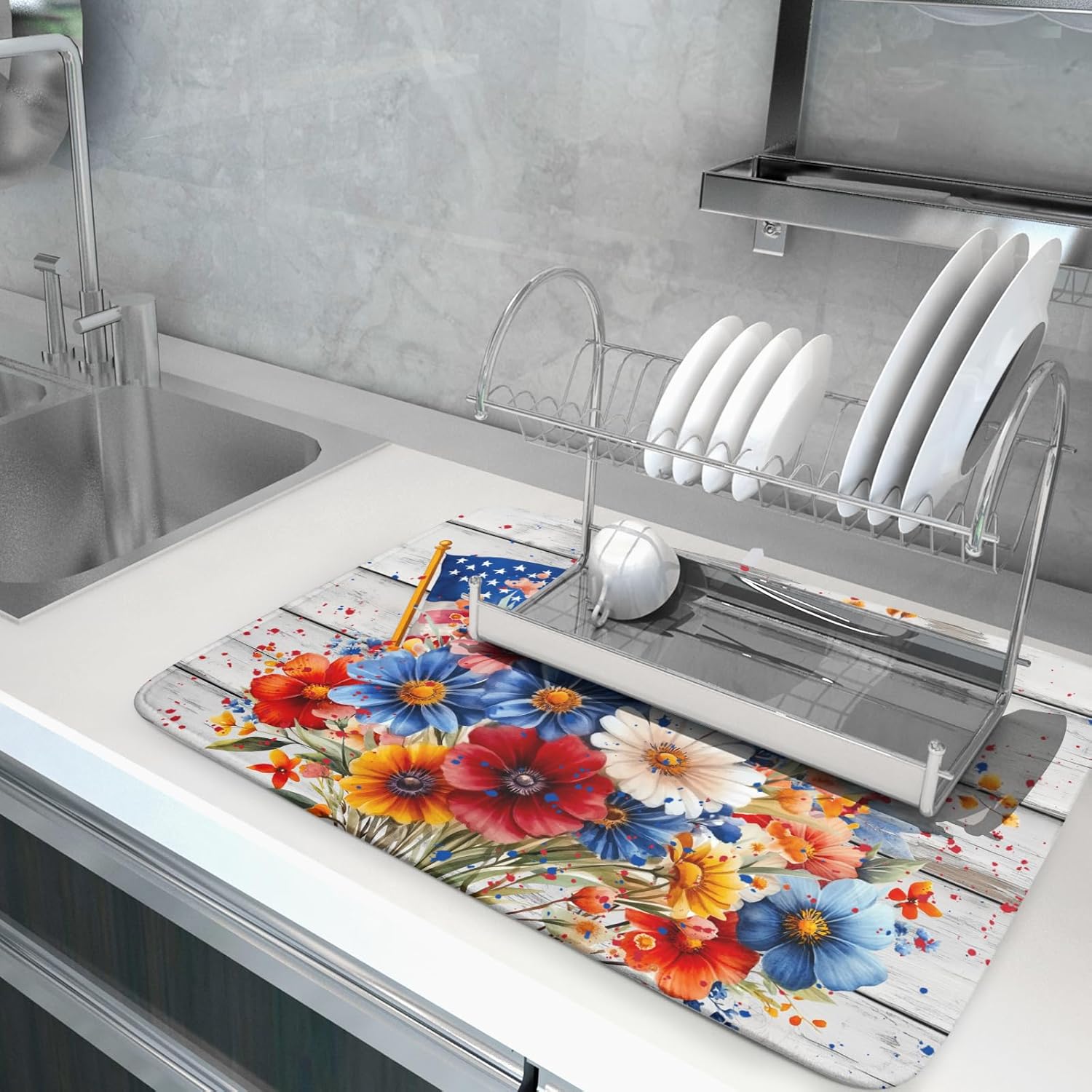 4th of July Dish Drying Mat 18x24 inch Patriotic Floral Fast Dry Microfiber Reversible Dish Drainer Rack Pad Kitchen Counter Accessories