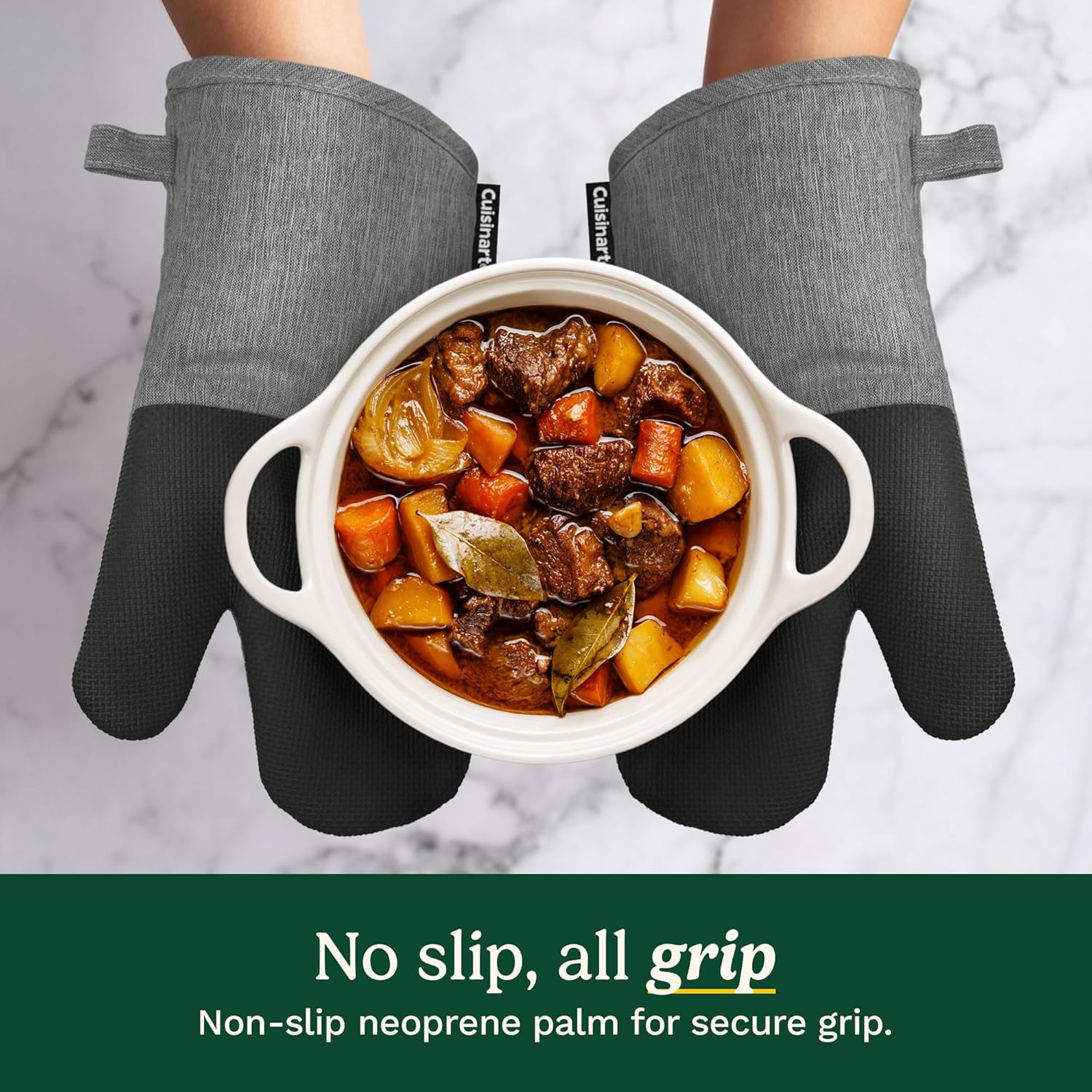 - COOK WITH CONFIDENCE: The Cuisinart Chambray Oven Mitt Set, measuring 7 x 13 inches, features a heat-resistant neoprene palm for superior protection (up to 350 degrees); handle hot cookware with ease and enjoy a secure grip with these oven mits, making cooking, baking, and grilling safer.