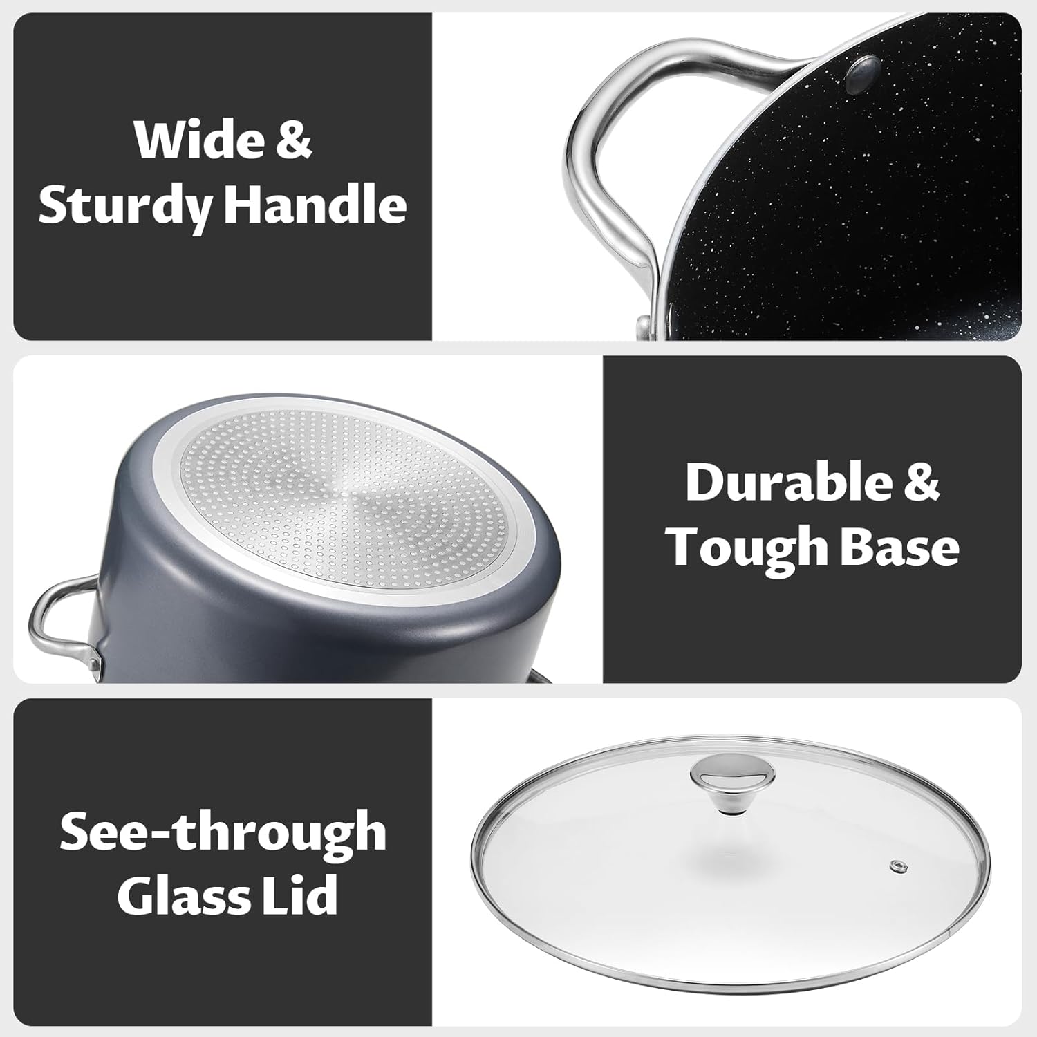 - Compatible With All Cooktops: This warp-resistant, non stick pots seamlessly works on induction, gas, electric, & halogen stovetops for versatile cooking