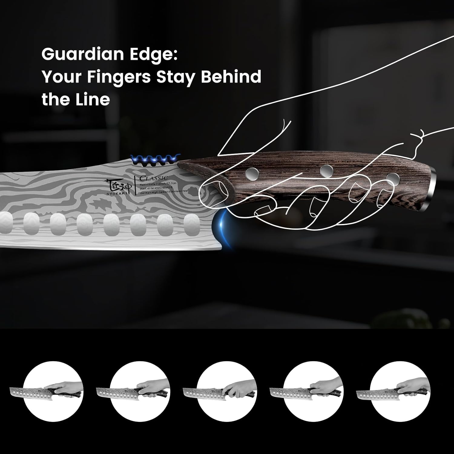 - 1 HANDGUARD, 0 COMPROMISE ON SAFETY—The thoughtful guarded grip design, prevents the hand from sliding towards the blade, as a special structure between the blade and the handle, is the perfect combination of craftsman aesthetics and mechanism safety suits both left/right-handed users, even wet foods such as tomatoes, can be confidently sliced