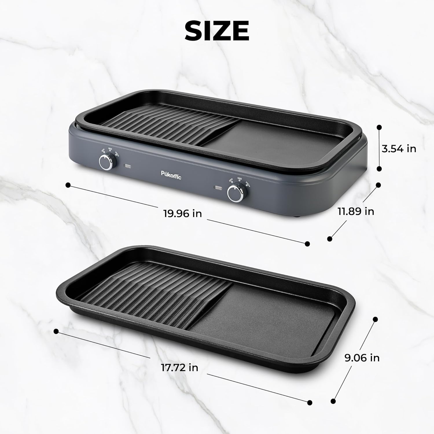 Pukomc Electric Indoor Grill,1500W,Non-Stick Cooking,Adjustable Dual Cooking Zones with,indoor grills electric smokelessSafe for Family, Party, Kitchen Use,gray