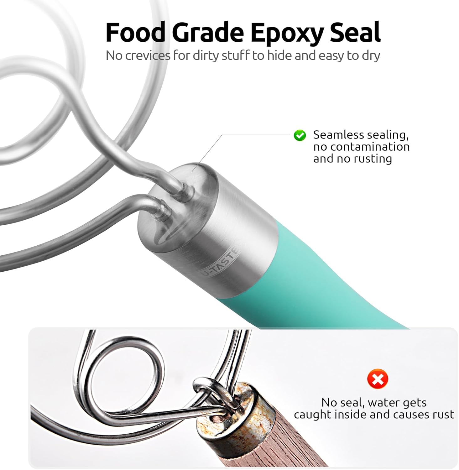 - [Heavy Duty Ergonomic 8.6in Long Handle] Are you still worried about your blender's mixing head falling off wooden handle? Compared to others’ wood handle, U-Taste’ sourdough whisk chooses silicone handle, which bonds more firmly to the stainless steel, offers comfortable, non-slip grip, allows long-lasting and heat-resistant use. No more breaking, falling off or food safe issues. 8.6in long keeps your hands clean from sticky dough. 0.95in wide allows mix heavy doughs without hand fatigue.