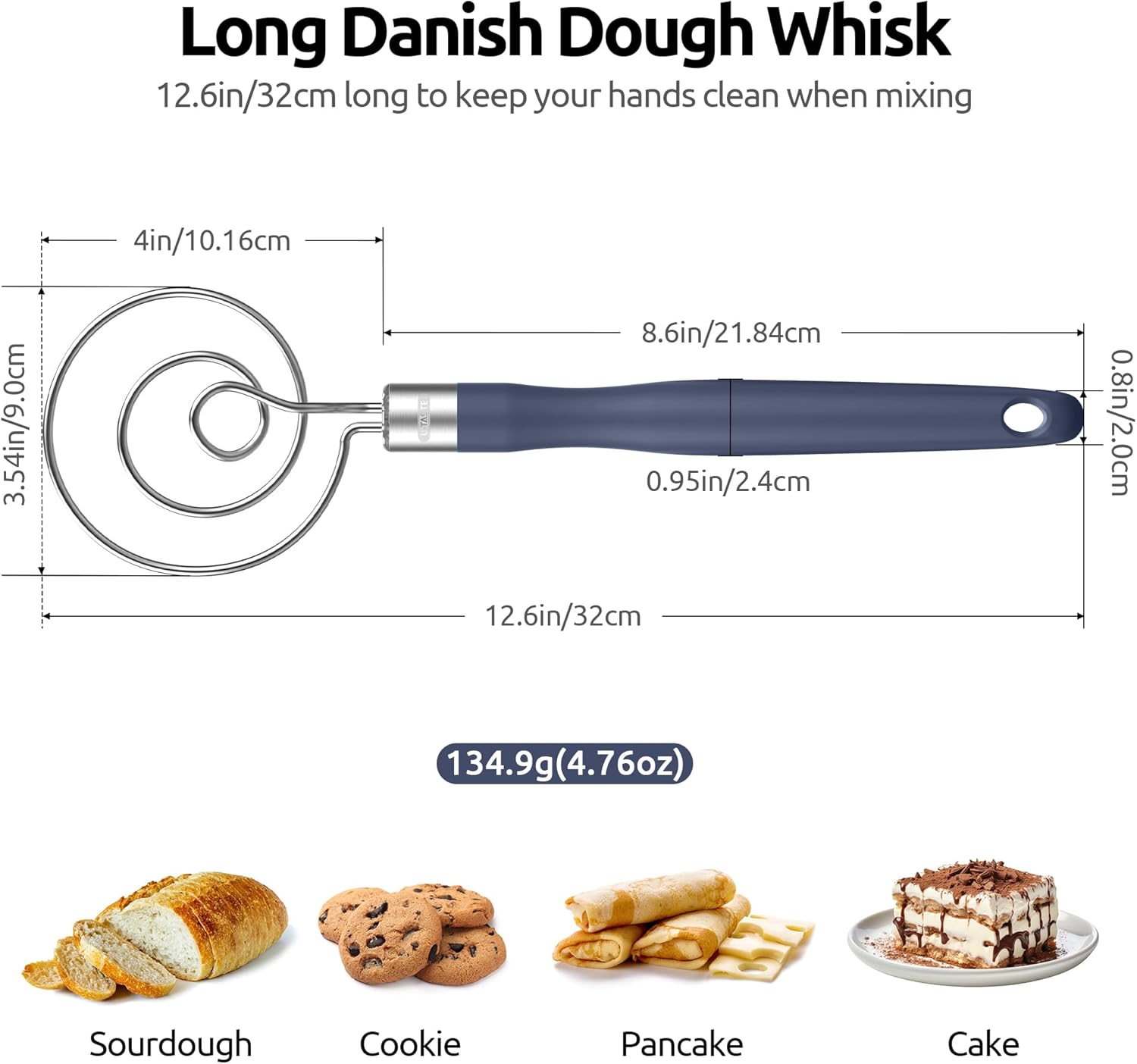 - [18/8 Stainless Steel and Food Grade Silicone] The metal wire ring is 0.138in thick, which is food grade, sturdy, not deformed, rustproof and corrosion-resistant, working well for thick dough and stiff batter. Food-safe silicone handle reinforced with stainless steel rings without head falling off issues. Unlike egg whisks, our Danish mixer is sturdier for heavy mixing. Compared to wooden whisks, no worries about wood chips falling into your food or wood splinters hurting your hands.