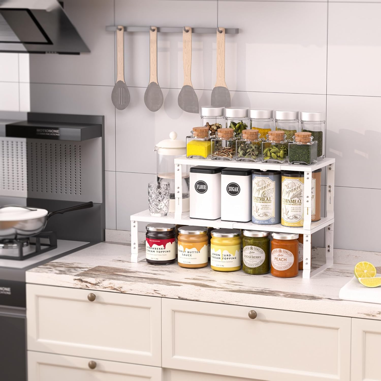 Heavy-Duty Adjustable Metal Shelf Organizer - Expandable & Stackable Pantry Storage Rack for Kitchen, Bathroom, RV, Cabinets(2 Packs/White, Large)