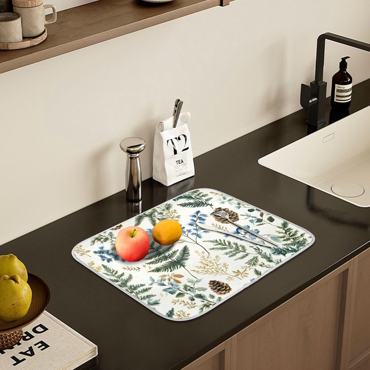 Vintage Herbs Fern Leaves Floral Plant02 Dish Drying Mat for Kitchen Counter Absorbent Microfiber Large Drying Pad Dish mats for Kitchen Countertops 18 x 24 Inch