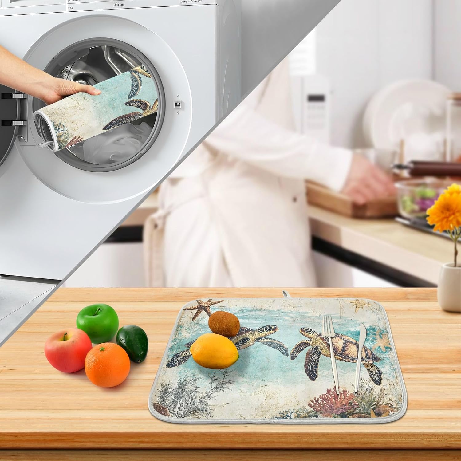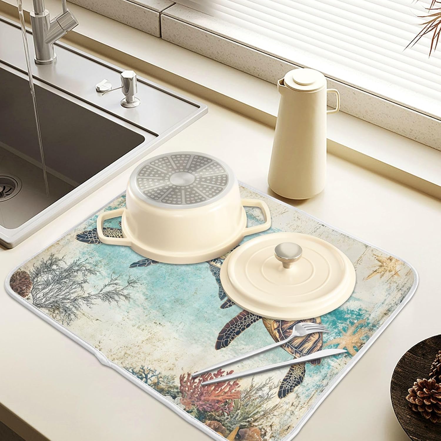 Vintage Ocean Sea Turtle04 Dish Drying Mat for Kitchen Counter Absorbent Microfiber Large Drying Pad Dish mats for Kitchen Countertops 18 x 24 Inch