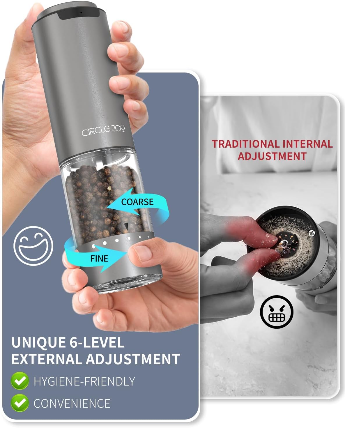- 【VERSATILE FOR MULTIPLE SPICES】 - Unlock a world of flavors with the versatile and efficient CIRCLE JOY electric pepper grinder. Designed for precision and convenience, this grinder is perfect not only for pepper and salt but also excels at grinding a myriad of spices . Whether you're adding a dash of freshly ground nutmeg to your morning coffee, infusing your dishes with aromatic cinnamon, or spicing up your meals with vibrant cumin and coriander, the CIRCLE JOY grinder has got you covered