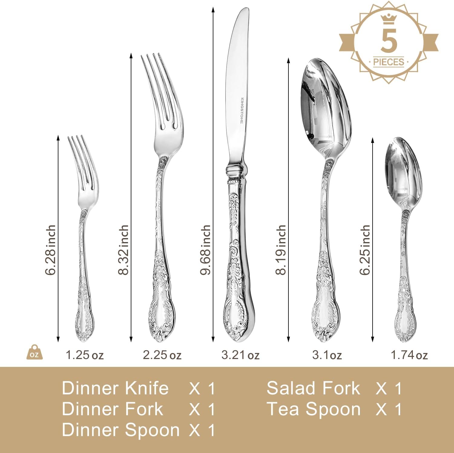 - FLATWARE SET INCLUDES: 5-piece flatware set includes 1 dinner knives (9.68 inch/3.21 oz), 1 dinner forks (8.32 inch/2.25 oz), 1 dinner spoons (8.19 inch/3.1 oz), 1 salad forks (6.28 inch/1.25 oz) and 1 teaspoons (6.25 inch/1.74 oz), service for 1