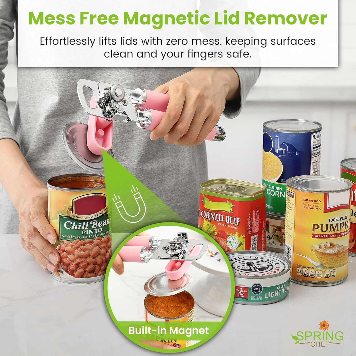 Spring Chef Stainless Steel Can Opener - Manual with Soft Grip Handles, Easy Turn, Heavy Duty Hand Can Openers for Seniors with Smooth Edge - Magnetic Lid Remover - Pink Lemonade