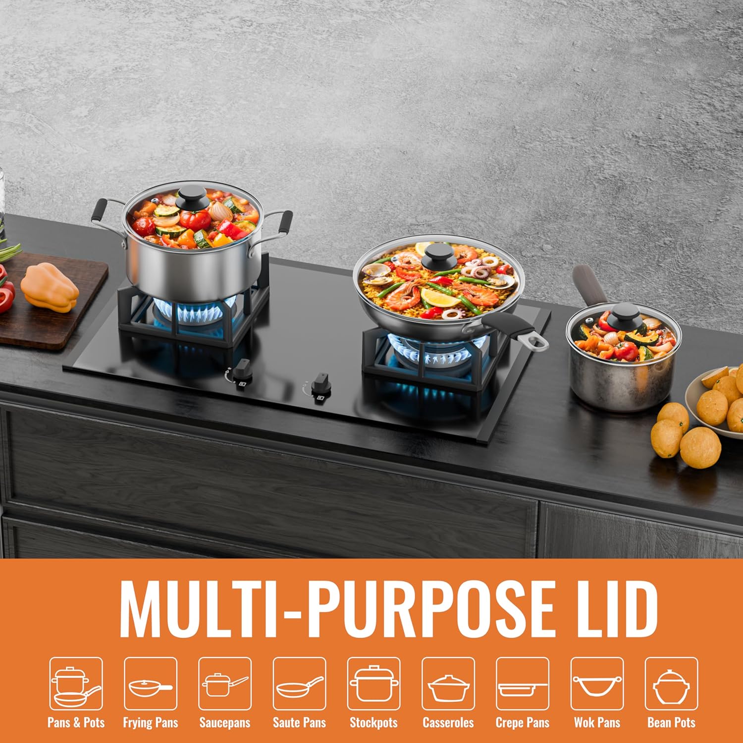 - STAINLESS STEEL RIM & STEAM VENT: The rust-resistant stainless steel rim, this pot cover enhances strength and longevity. The reinforced edge fits snugly on 12-inch pan lid and other standard cookware. The built-in SS304 steam vent can prevent boil-overs while retaining moisture. A must-have pan lid for cooking.
