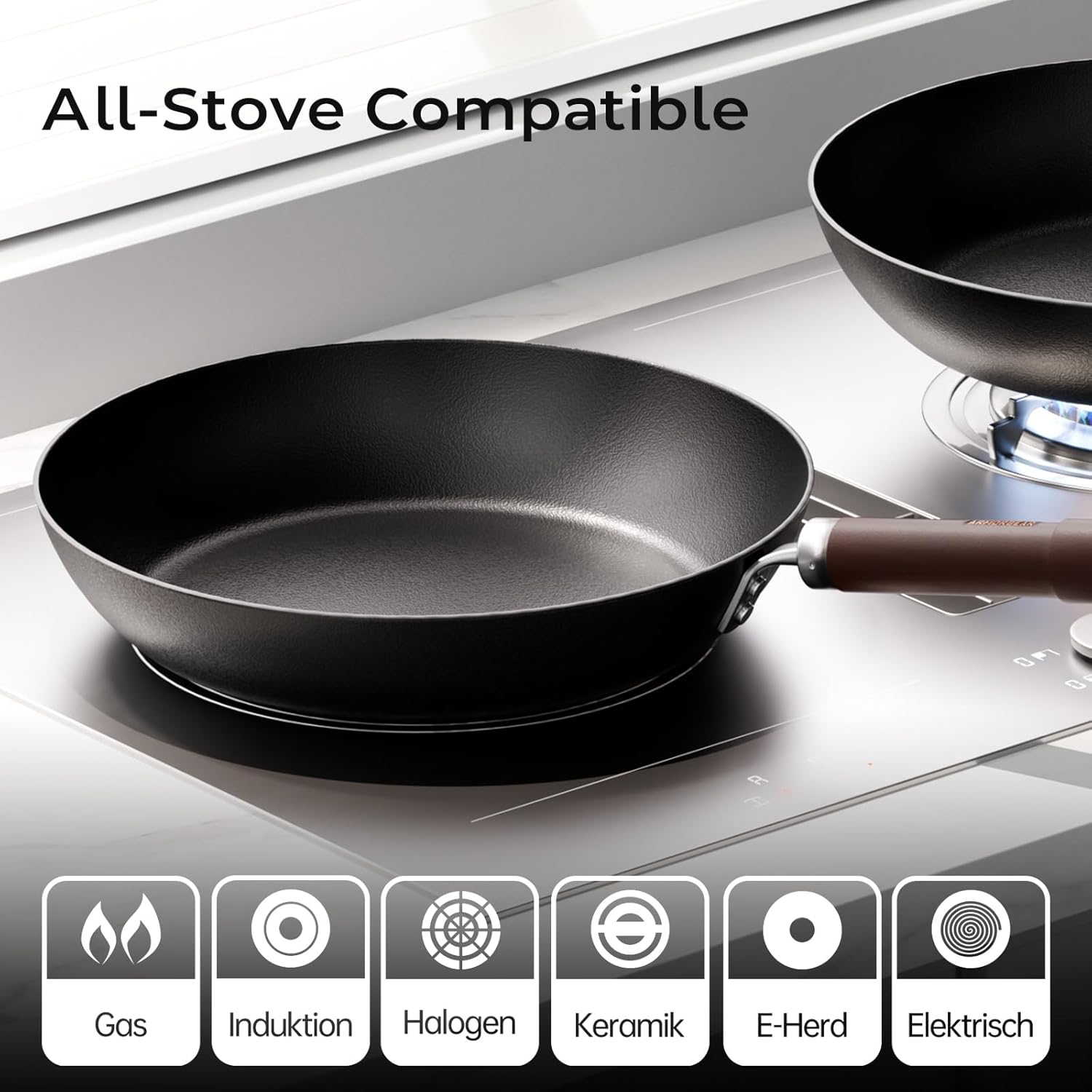 - Cool-Grip Assurance-----Our carbon steel frying pan features a heat-resistant wooden handle that stays cool on all stovetops (gas, electric, and induction), allowing you to cook longer without hand fatigue or the risk of burns.