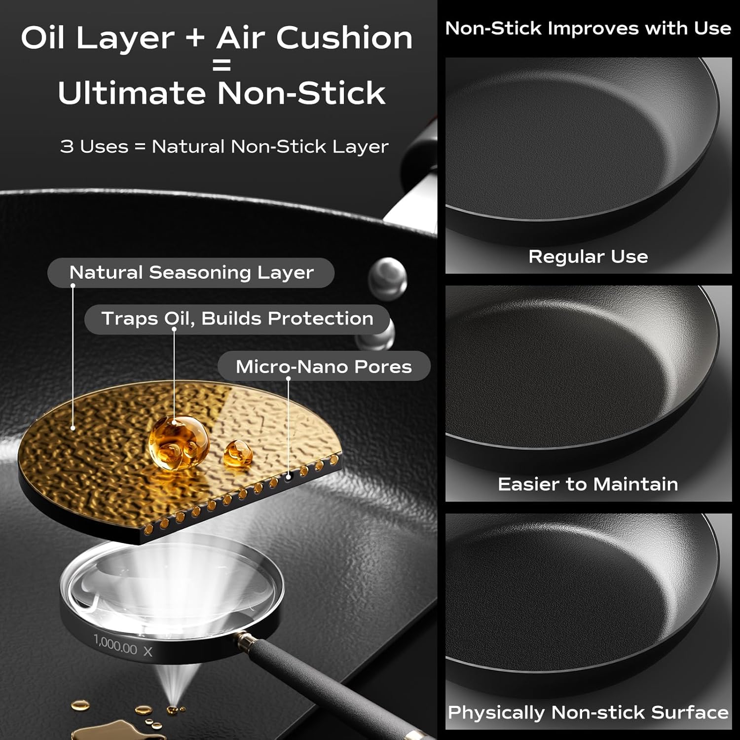 - Natural Oil-Seasoning Technology-----The skillet's textured surface naturally bonds with cooking oils during use, developing a durable, chemical-free non-stick layer that enhances performance over time. Requires less seasoning oil than traditional pans for optimal results while maintaining effortless maintenance—the more you cook, the better it performs.