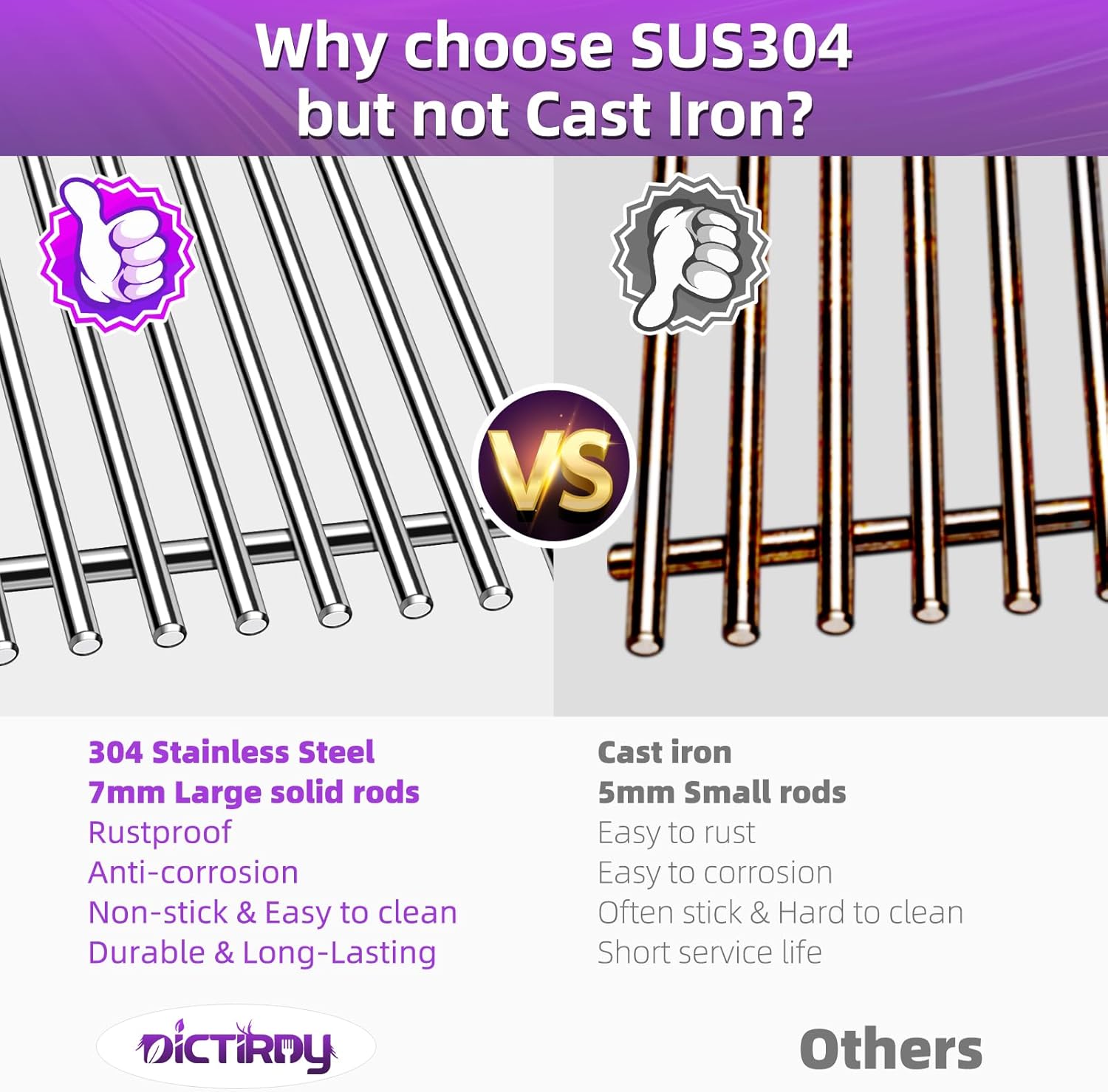 - 【Safe Material & Protect Your Hands】Dictirdy grill replacement parts are made of high-quality 100% food grade 304 heavy stainless steel and well-engineered to prevent rust, which is durable with uniform heating and high corrosion resistance, much more heavier and heavy duty. Our cooking grill grate with edge grinding design is free of sharp edges, made with nice welds and smooth surface, no sharp edges and will not hurt your hands. Best choice for your weber genesis ii 600 series gas grills.