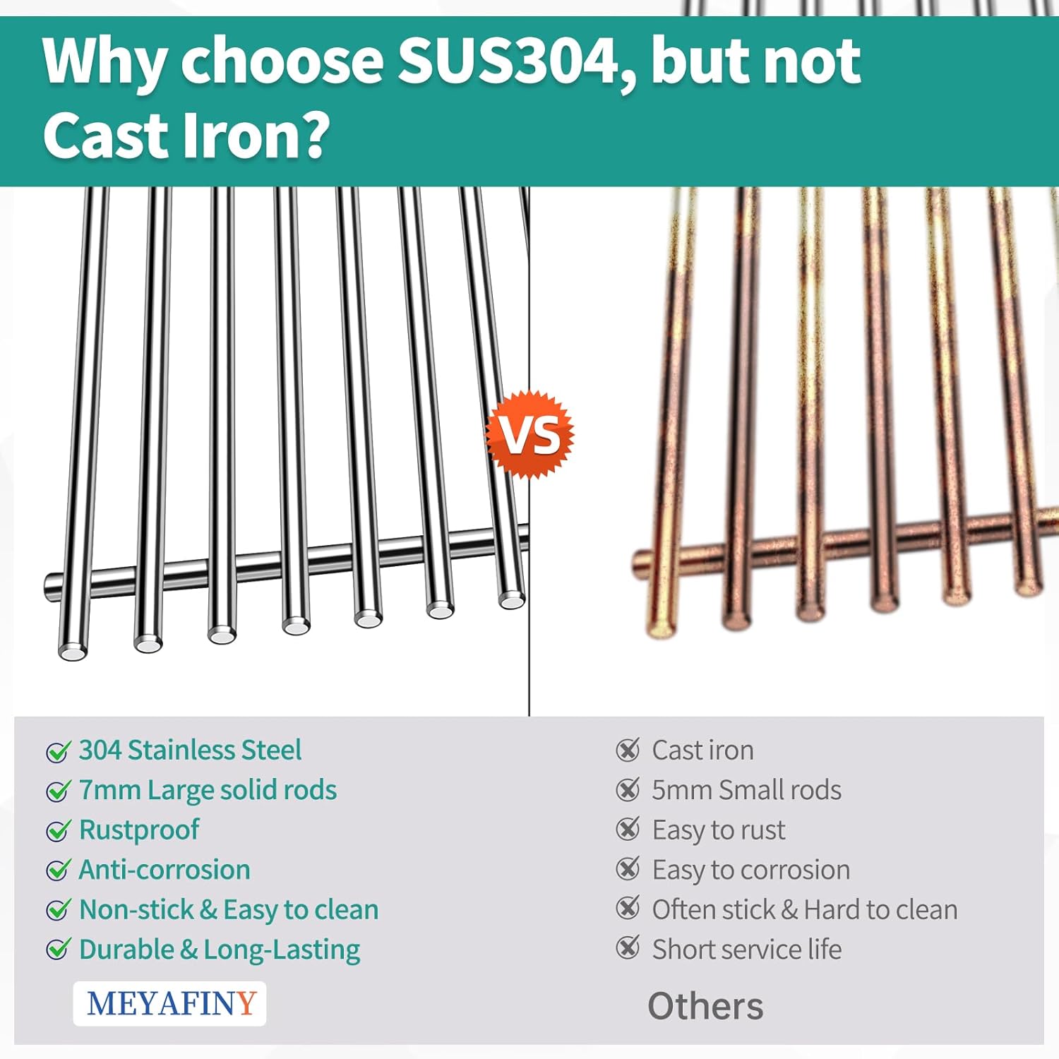- 【Safe Material & Protect Your Hands】Meyafiny grill replacement parts are made of high-quality 100% food grade 304 heavy stainless steel and well-engineered to prevent rust, which is durable with uniform heating and high corrosion resistance, much more heavier and heavy duty. Our cooking grill grate with edge grinding design is free of sharp edges, made with nice welds and smooth surface, no sharp edges and will not hurt your hands. Best choice for your weber genesis ii 600 series gas grills.