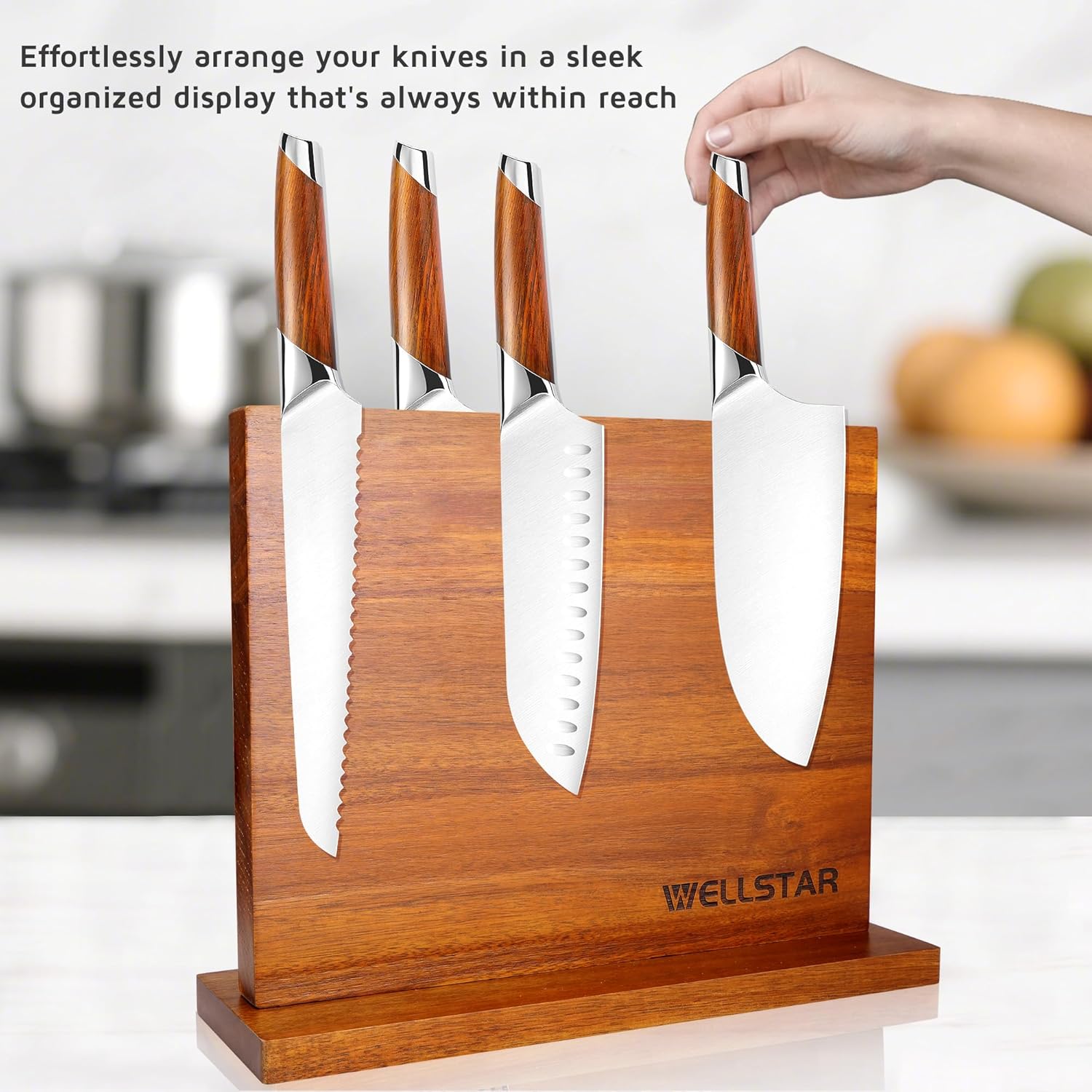 - [Acacia Elegance: Where Aesthetics Meet Functionality] Our Magnetic Knife Block Holder is a testament to the fusion of style and utility, flaunting a dual-sided design that gracefully organizes your kitchen knives. The exquisite acacia wood exterior infuses a refined warmth into your decor while promising durability and effortless maintenance.