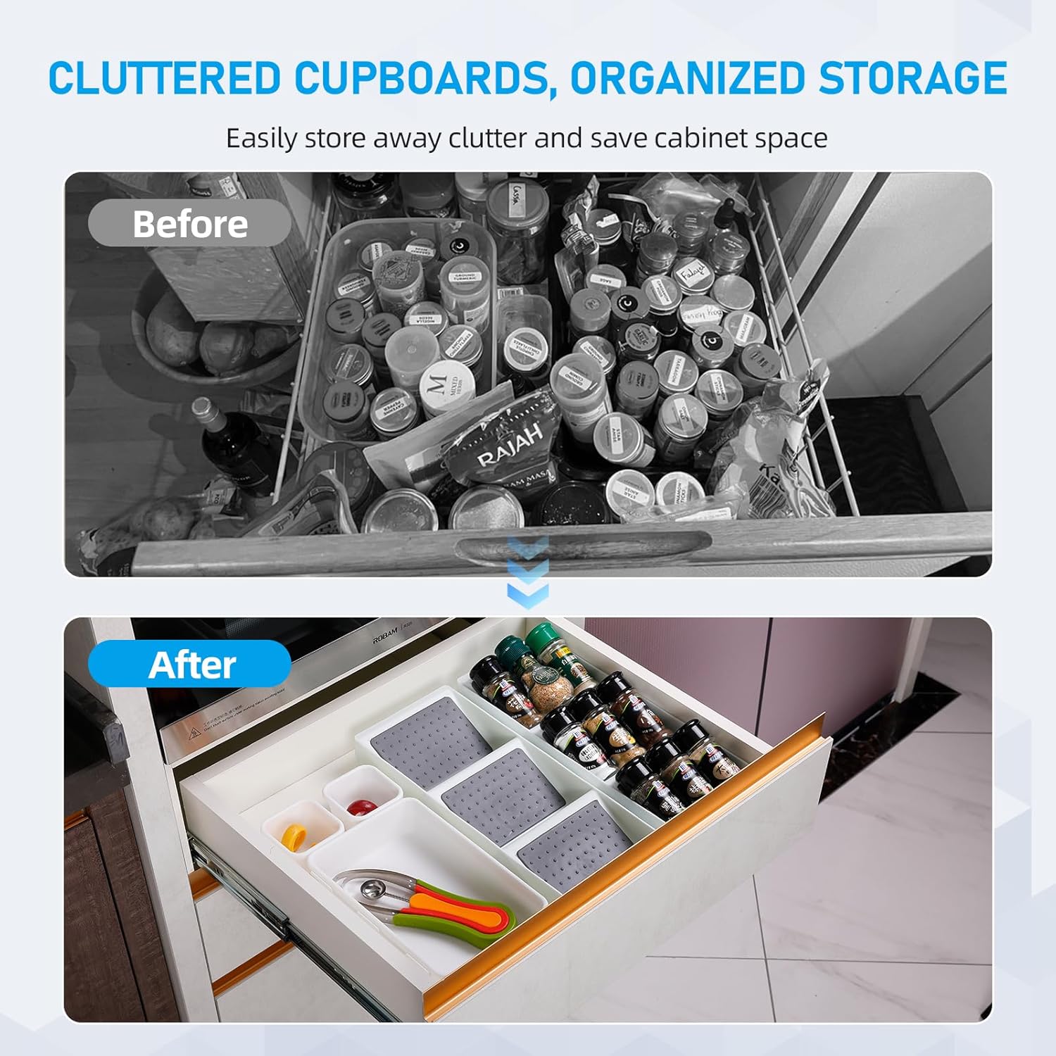 - PRACTICAL AND FUNCTIONAL: These drawer spice organizers fit most of the drawers in your home, you can place one or more depending on your drawer size. In addition, they can also be placed on kitchen countertops, cabinets, dressers, etc