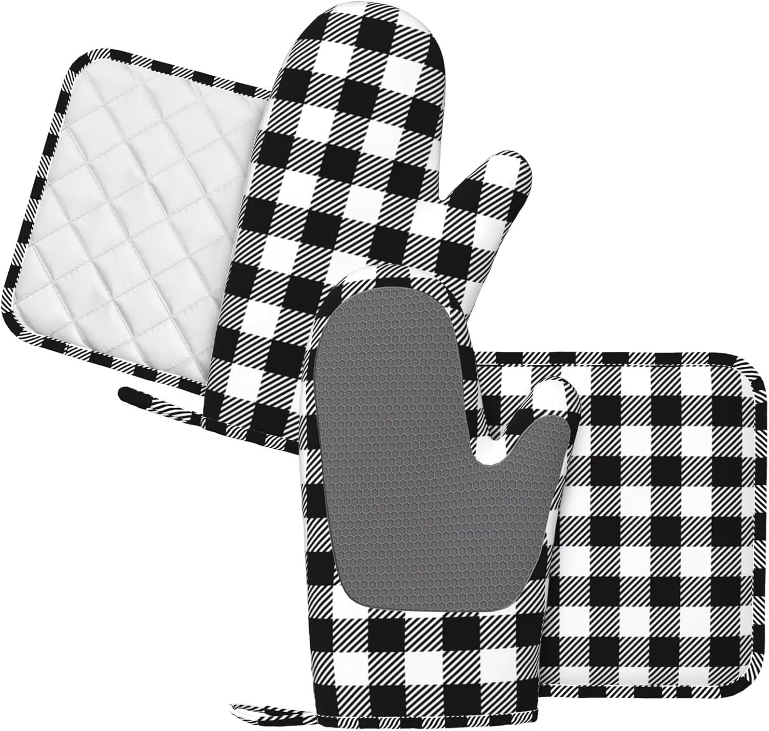 Black Checked Pattern Oven Mitts and Pot Holders Set of 4 Silicone Gingham Plaid Check Black Kitchen Mitten Gloves and Potholders Set Heat Resistant Oven Gloves Hot Holders for Kitchen